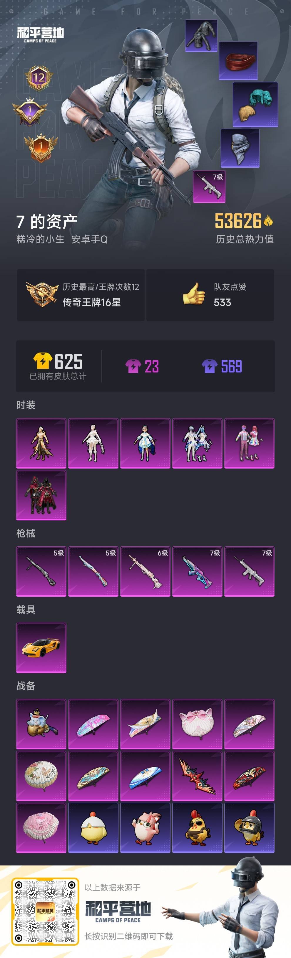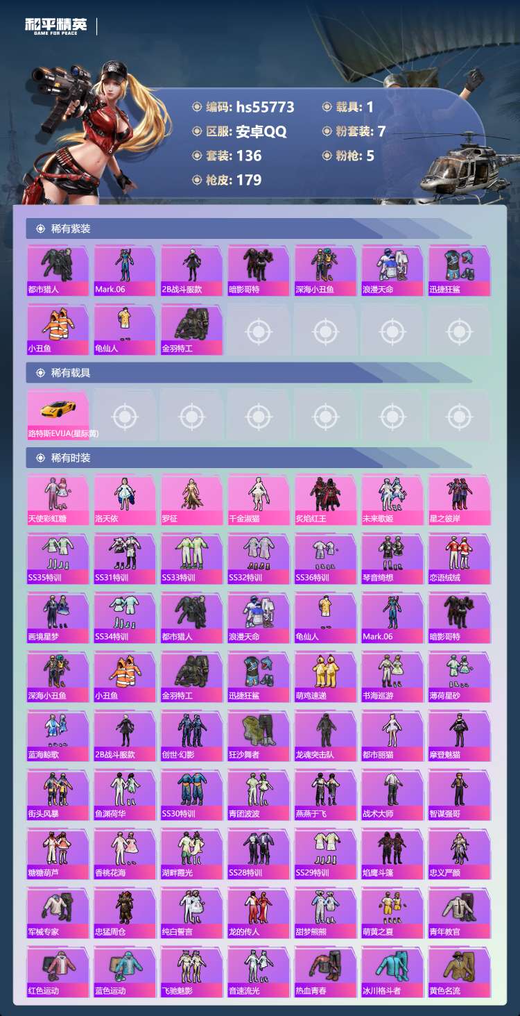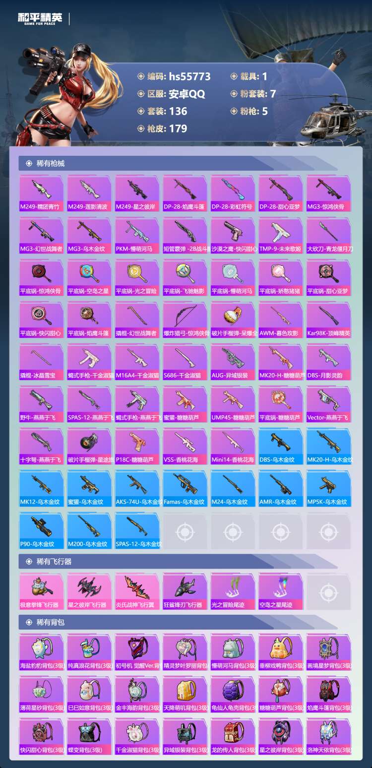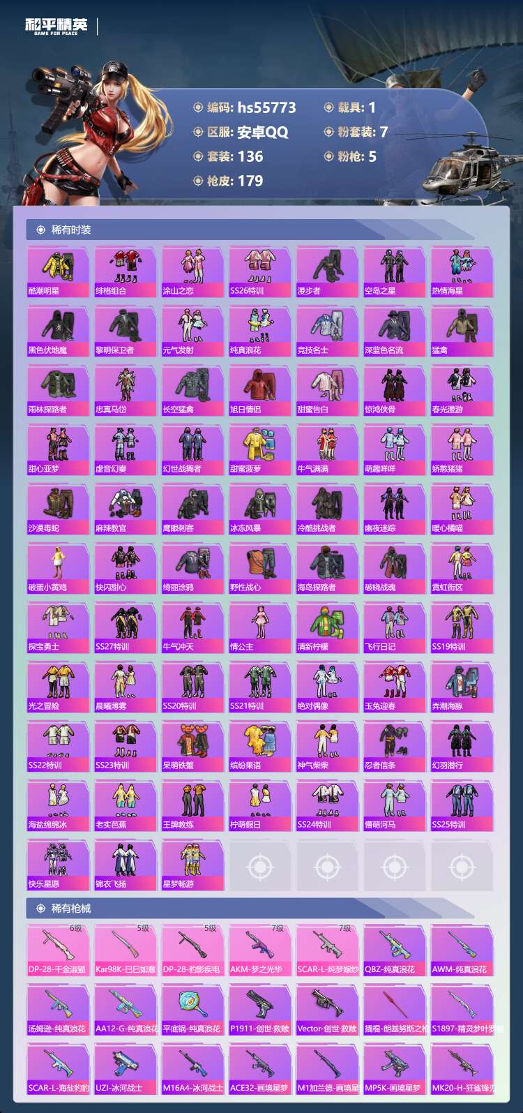 hs55773 安卓手Q-13王牌印记-7粉装-5特效枪-1载具-57982热力值-136套装-17