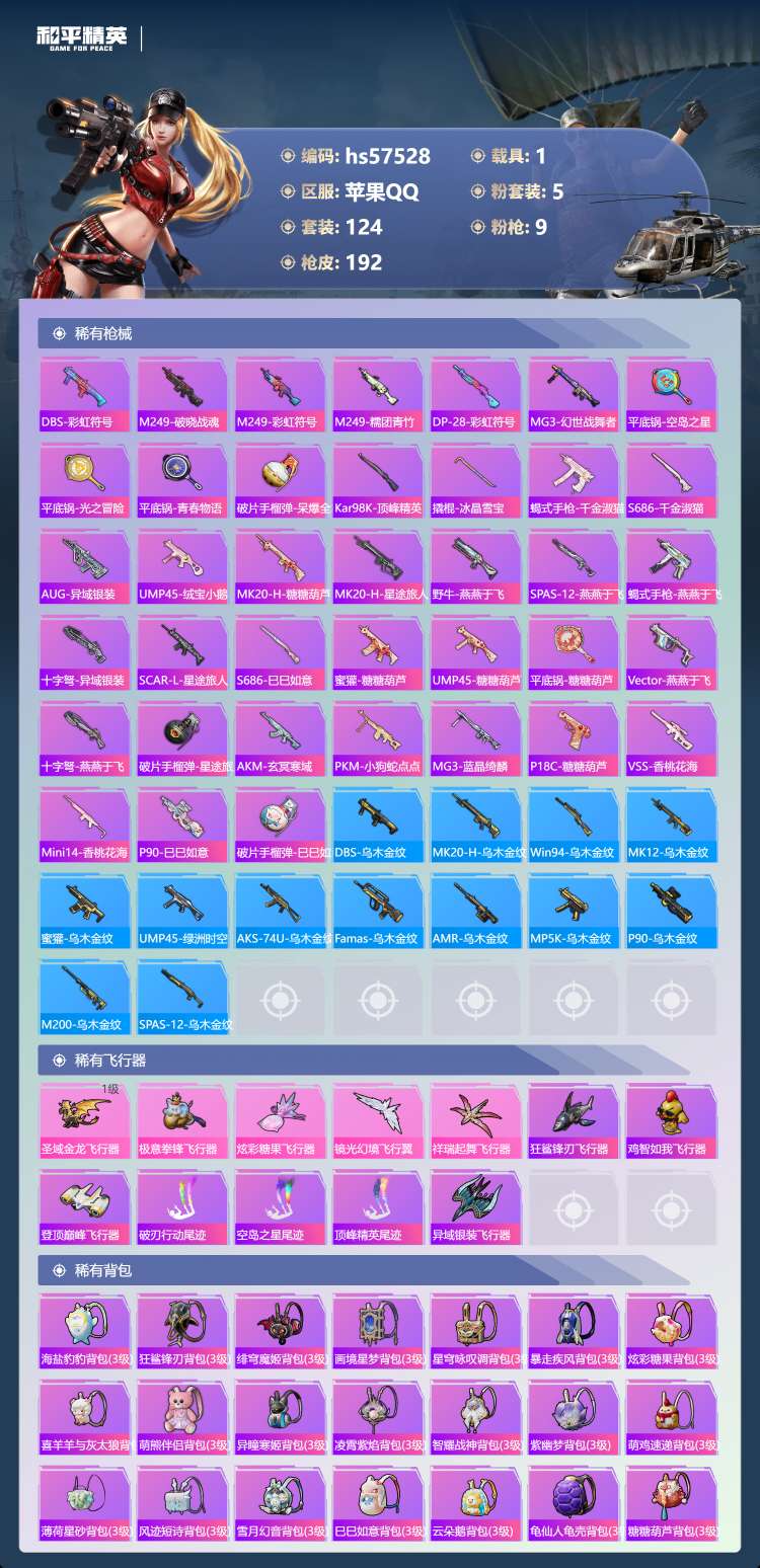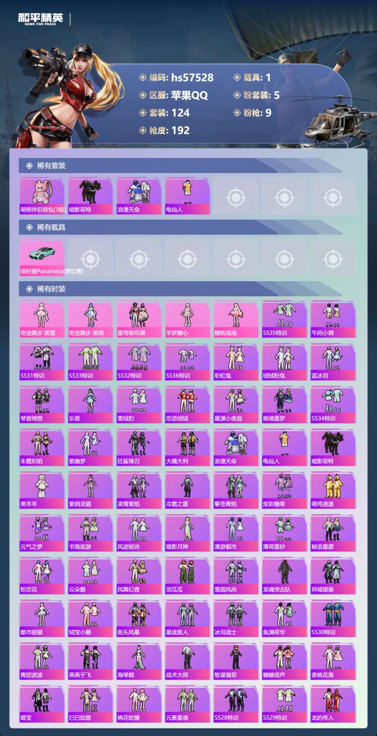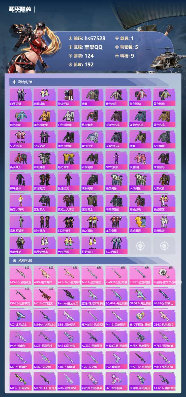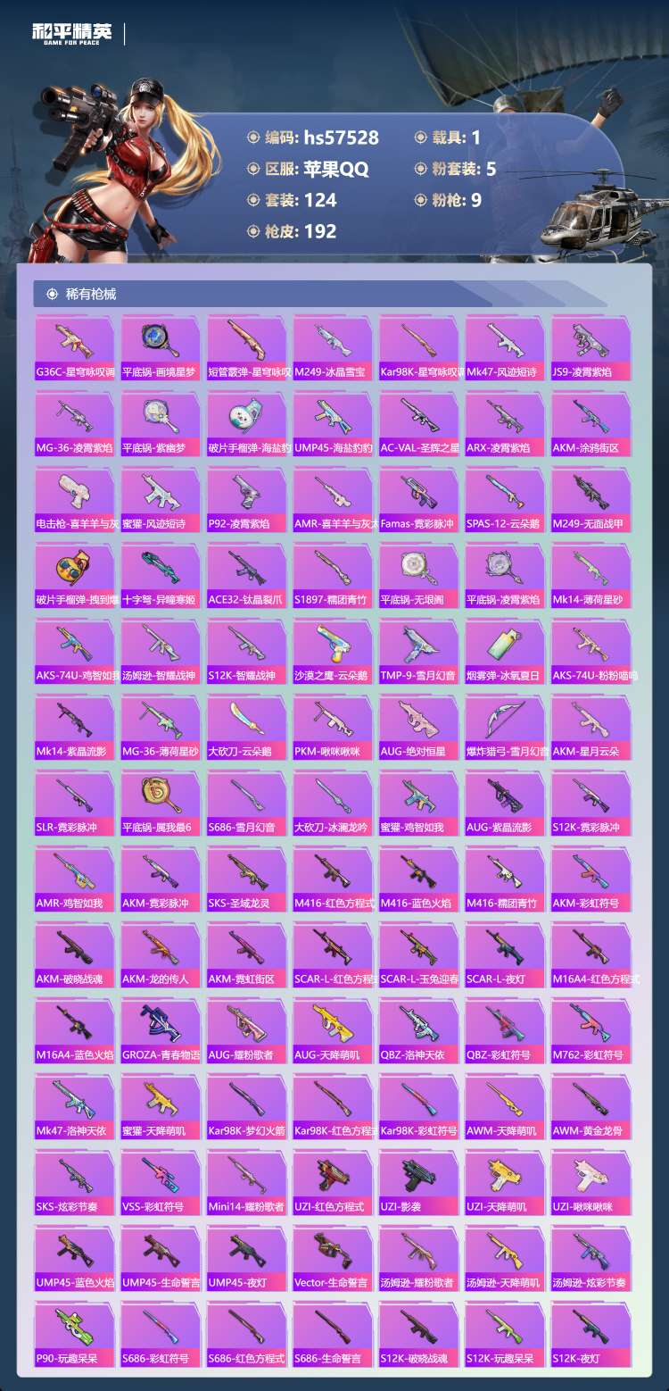 hs57528 苹果手Q-12王牌印记-5粉装-9特效枪-1载具-57893热力值-124套装-19
