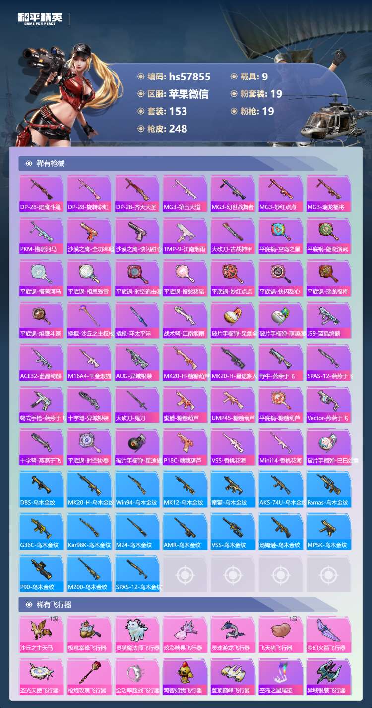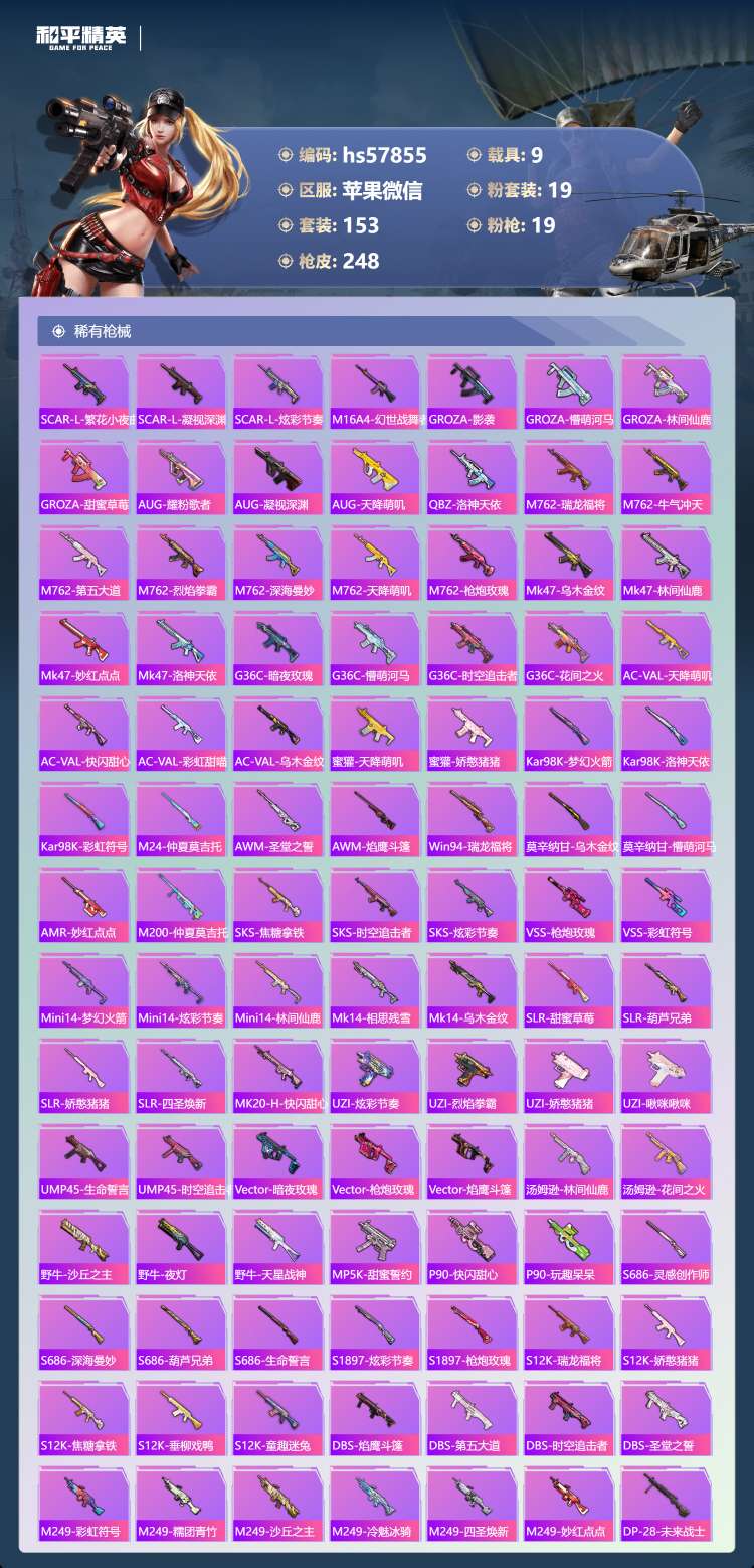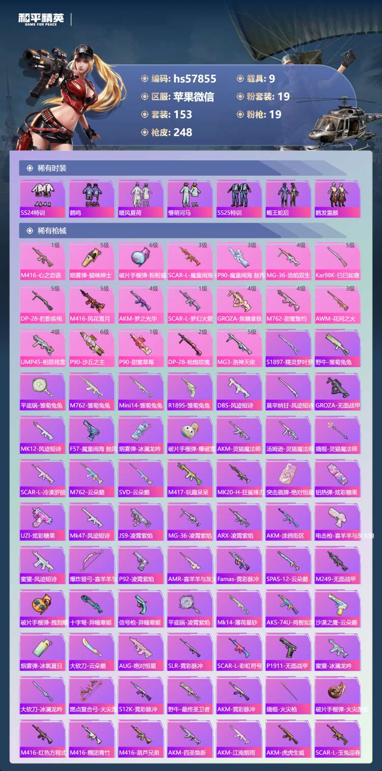 hs57855 苹果微-15王牌印记-2红装-19粉装-19特效枪-9载具-123180热力值-1