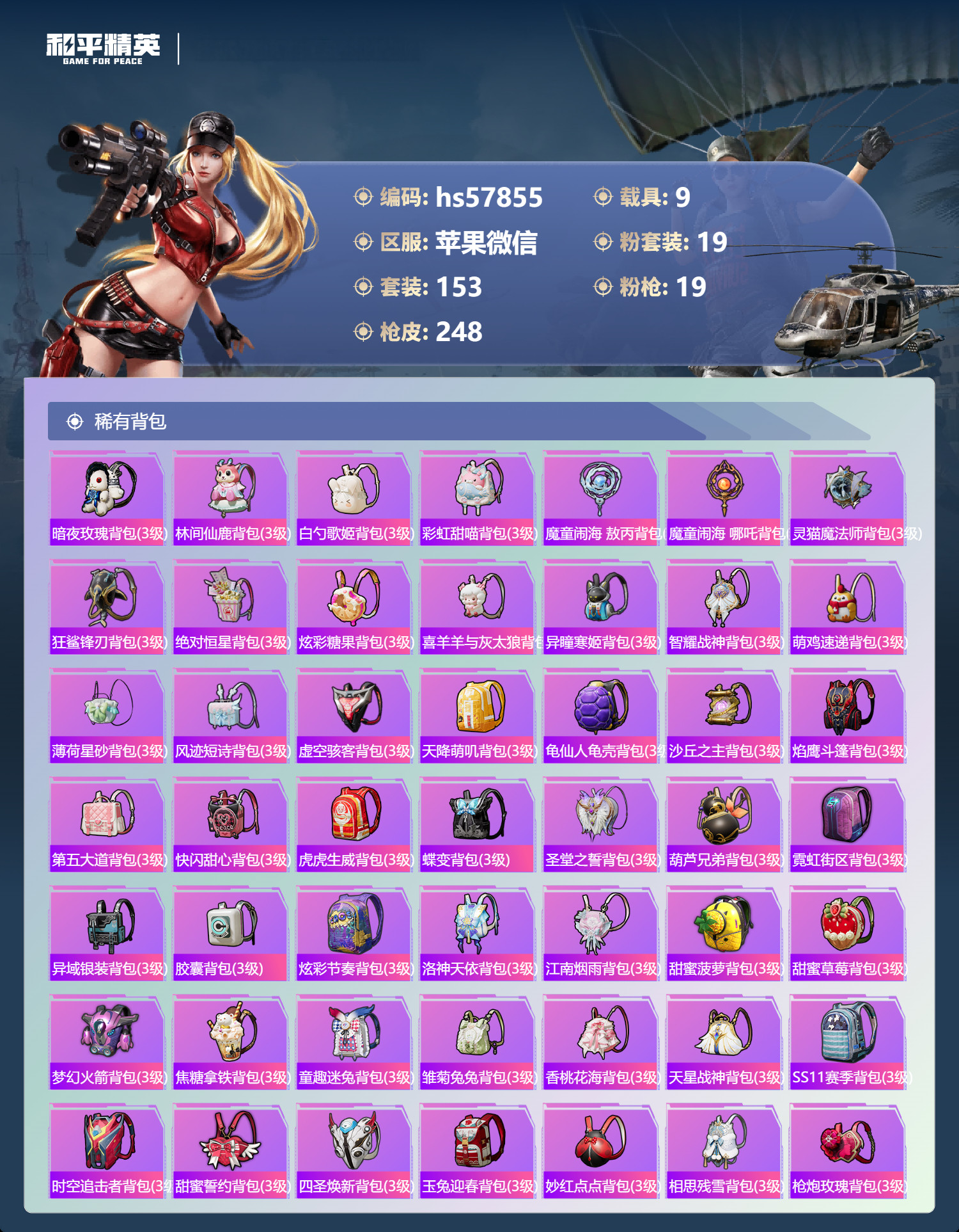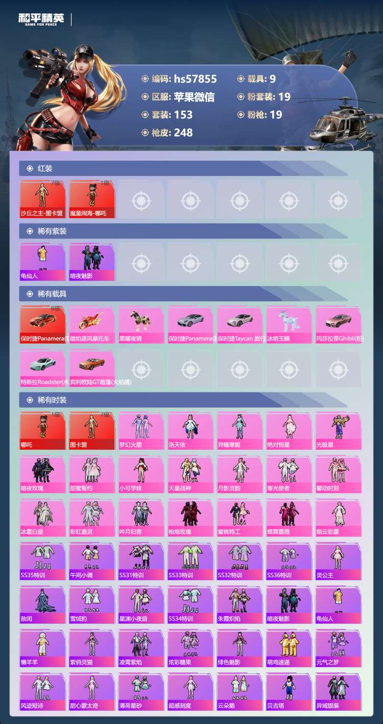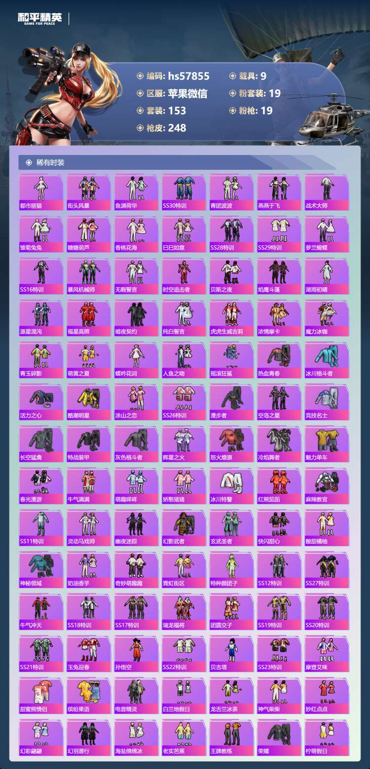 hs57855 苹果微-15王牌印记-2红装-19粉装-19特效枪-9载具-123180热力值-1