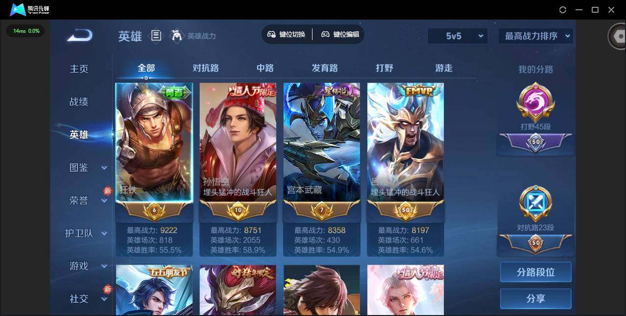 【金标狂铁 金标孙悟空 金标宫本武藏 金标吕布 金标铠 金标百里玄策 金标澜 金标阿轲 金标典韦】实名: 可修改 贵族等级: V7 英雄数: 126 皮肤数: 257 星传说: 未来机甲,幽冥之眼 传说皮: 久胜战神,末日机甲-孙尚香,地狱之眼,碎云,神器·狴犴令,山海·炽霜斩,燃星之曲,画中仙,神树通天 限定皮: 遇见飞天,李小龙,梁祝,时雨天司,飞衡,白虎志