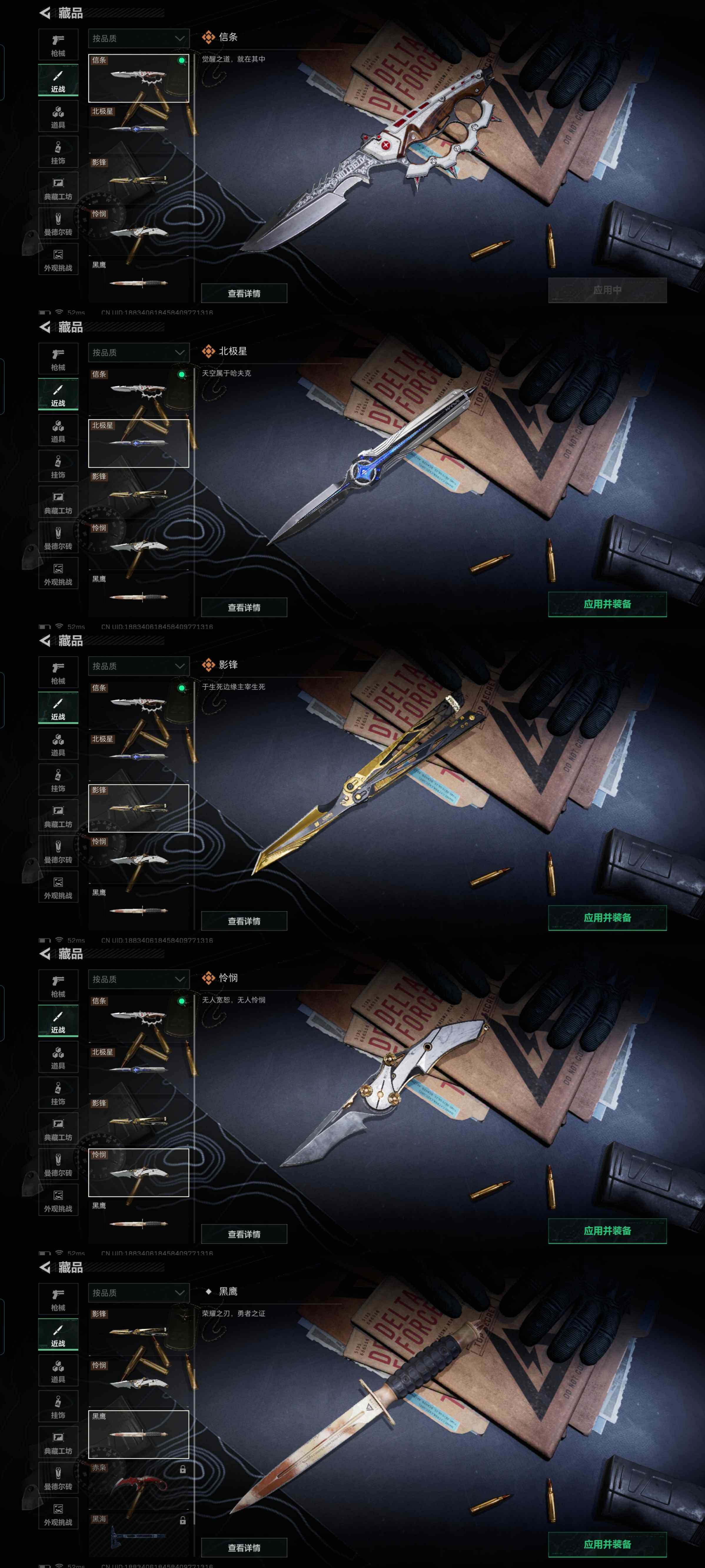 w95,4把刀怜悯信条北极星影锋,皮肤几乎全满,蚀金玫瑰水墨云图蛟龙特站队飞虎