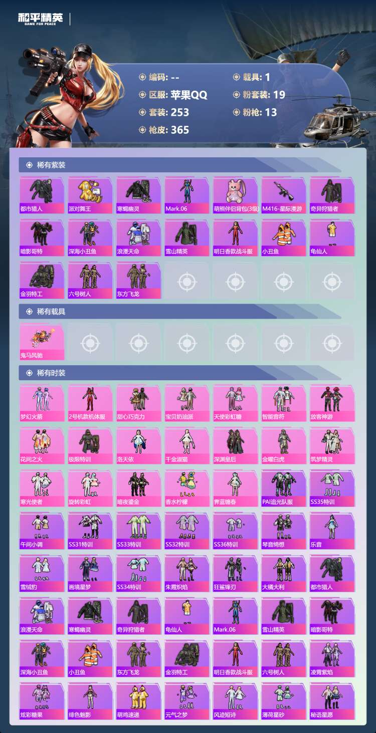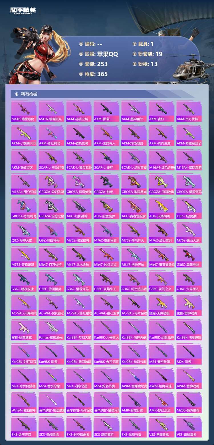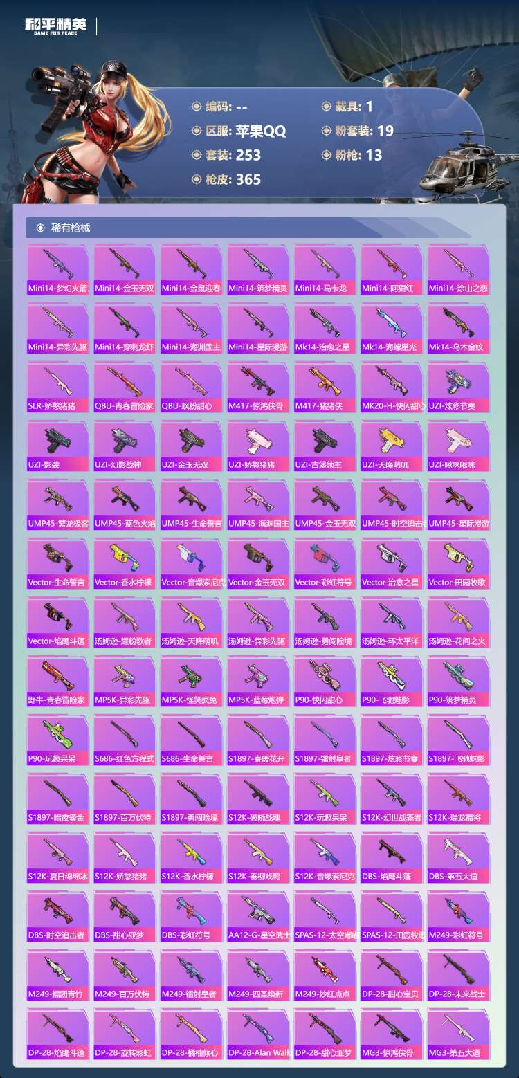 hs57467 苹果手Q-26王牌印记-有战神框-19粉装-13特效枪-1载具-130924热力值-