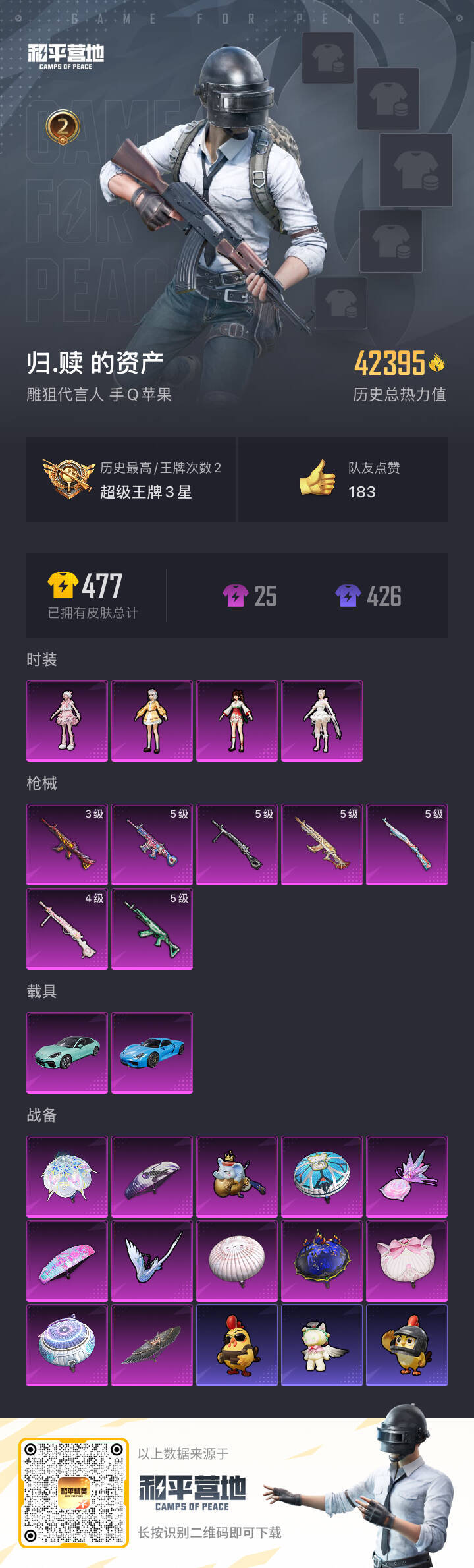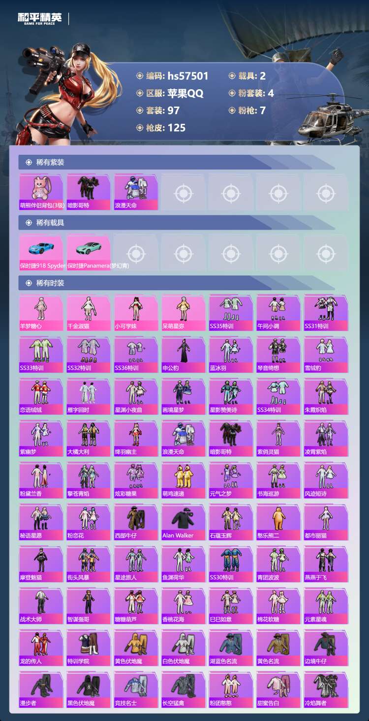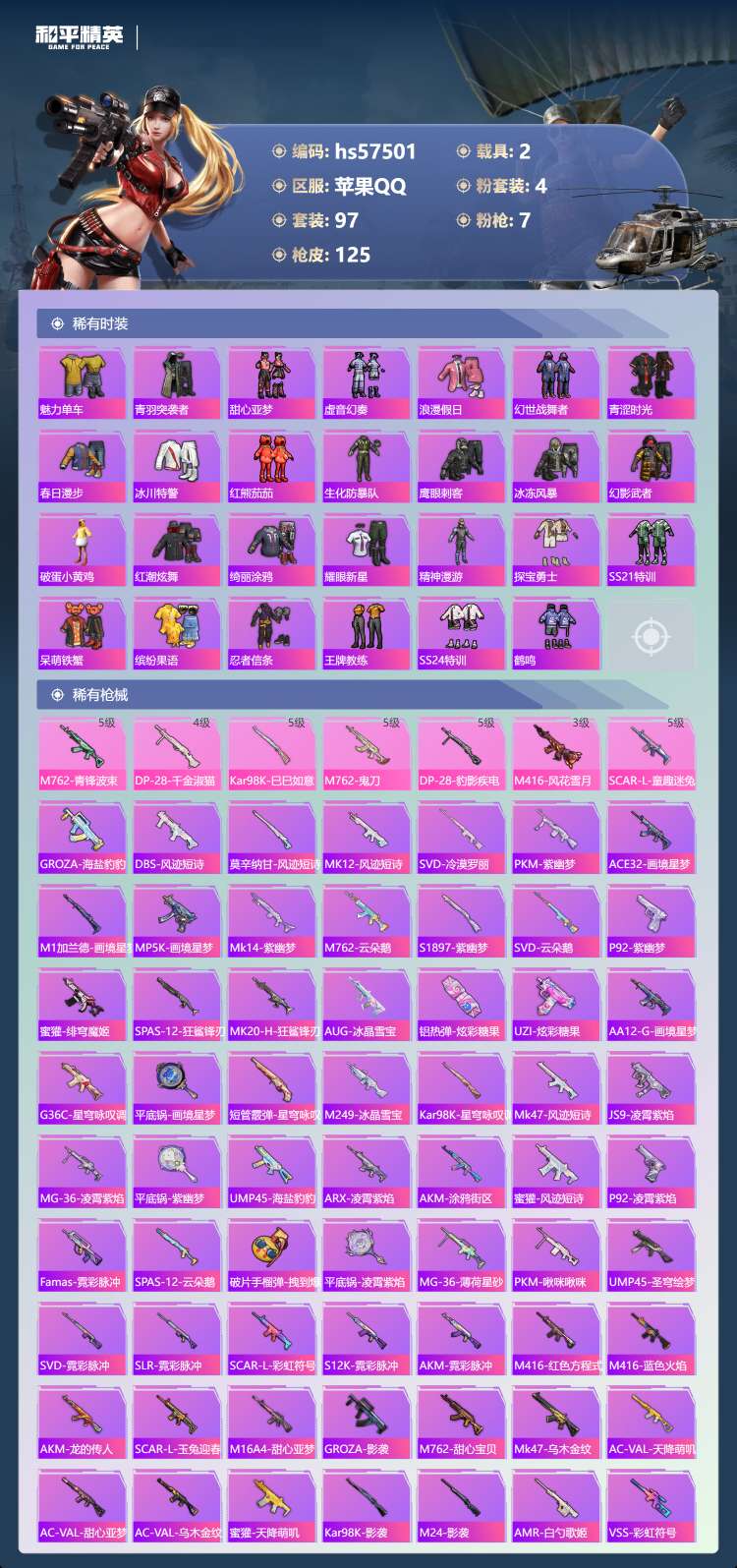 hs57501 苹果手Q-2王牌印记-4粉装-7特效枪-2载具-42659热力值-97套装-125枪