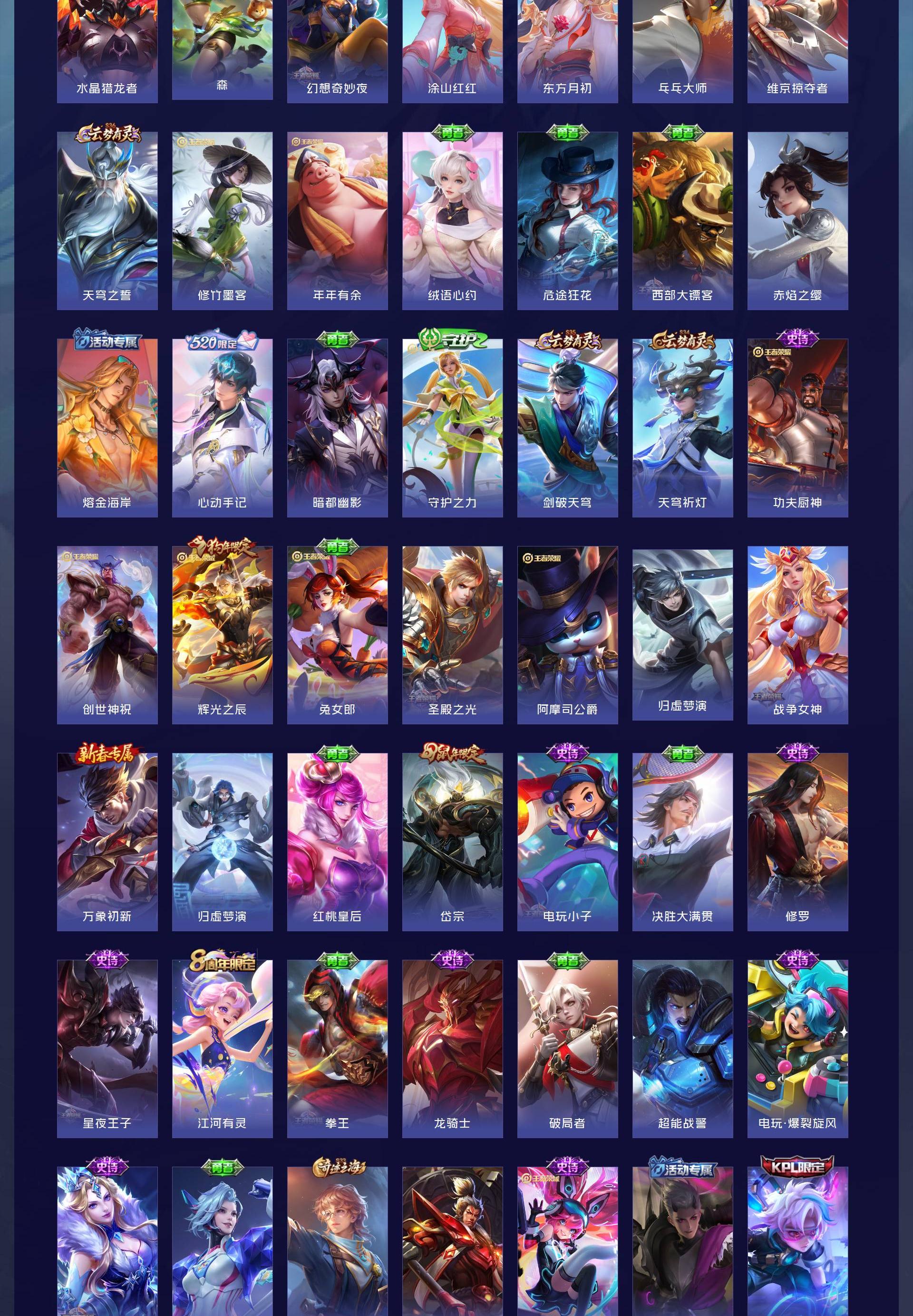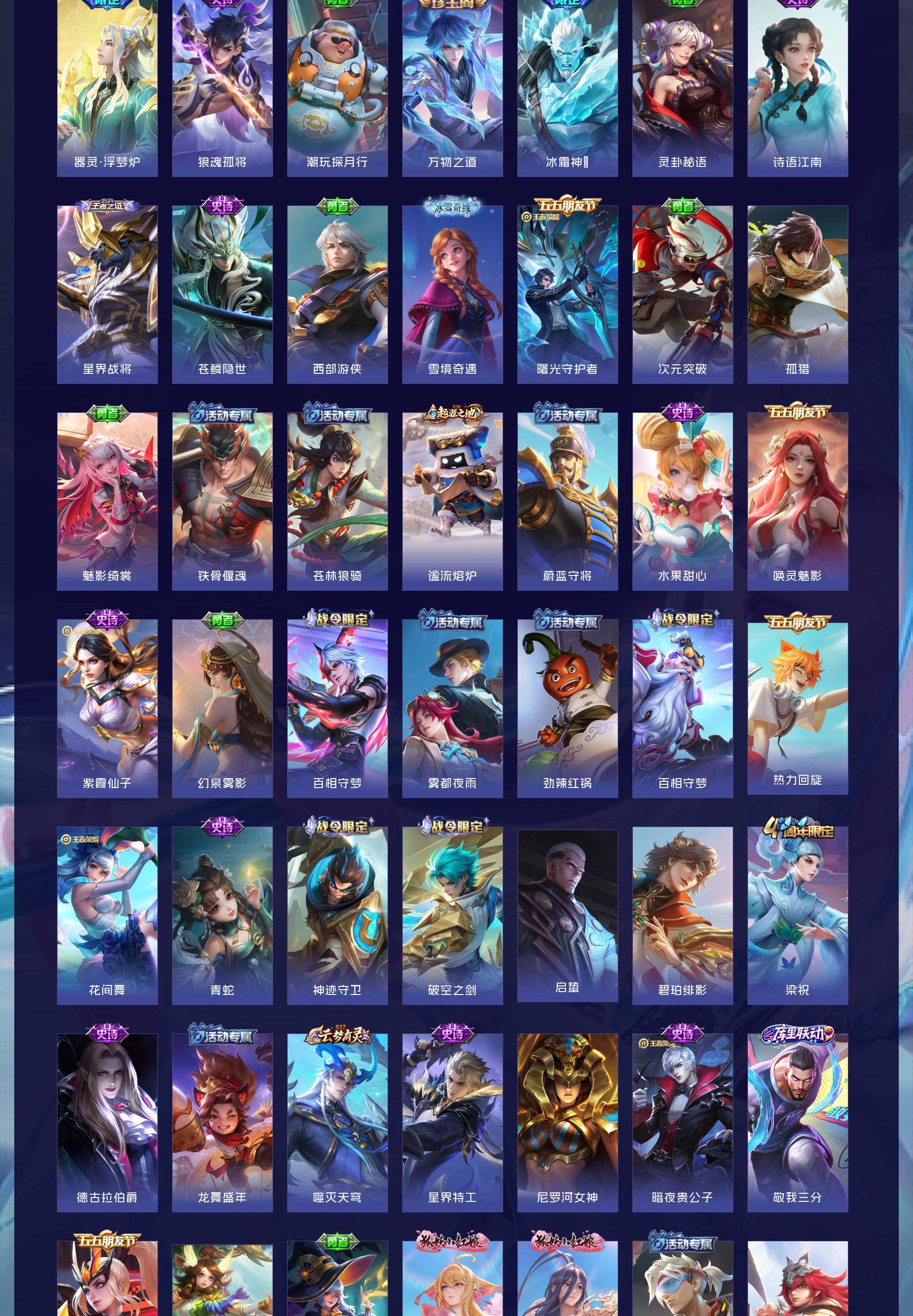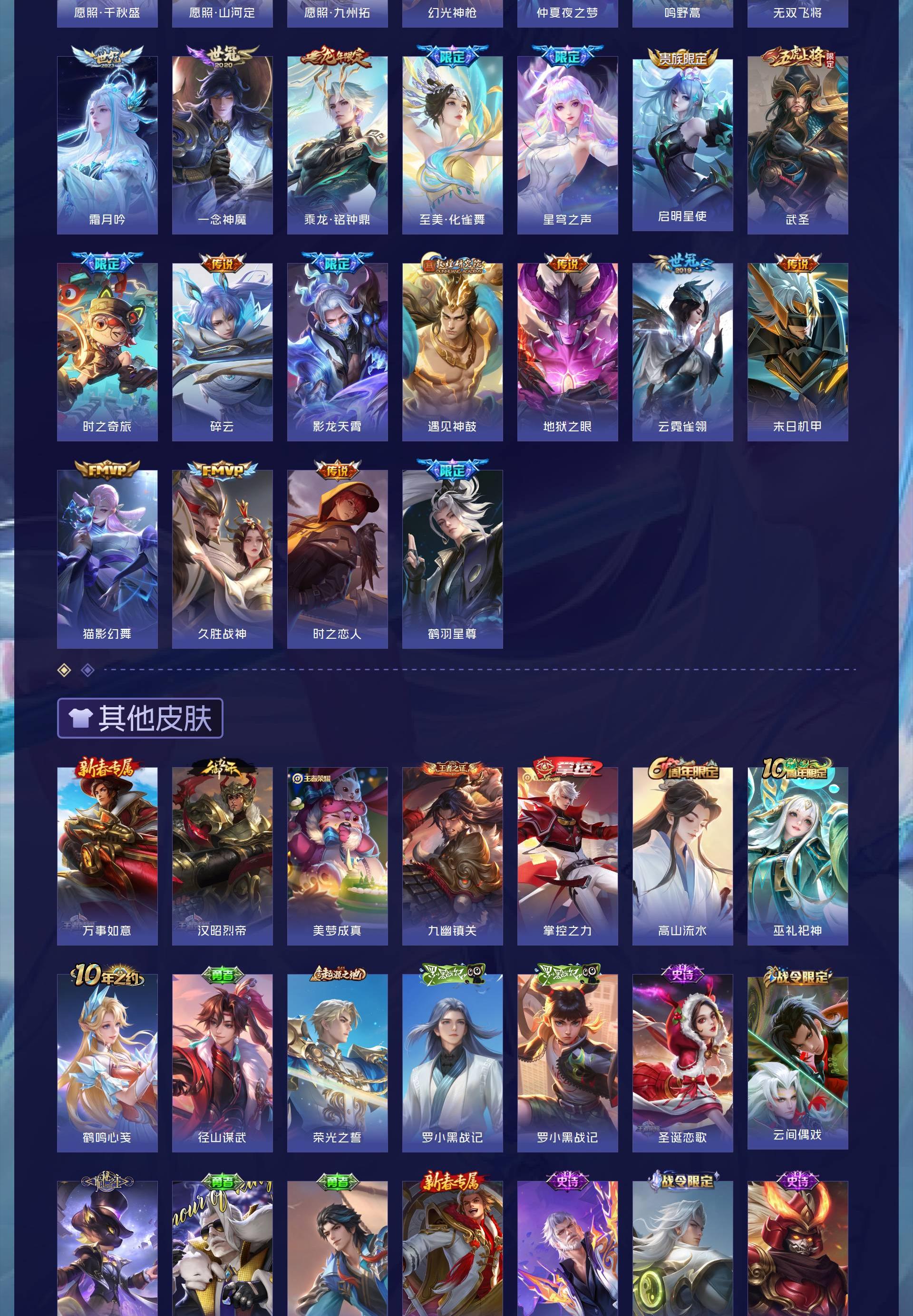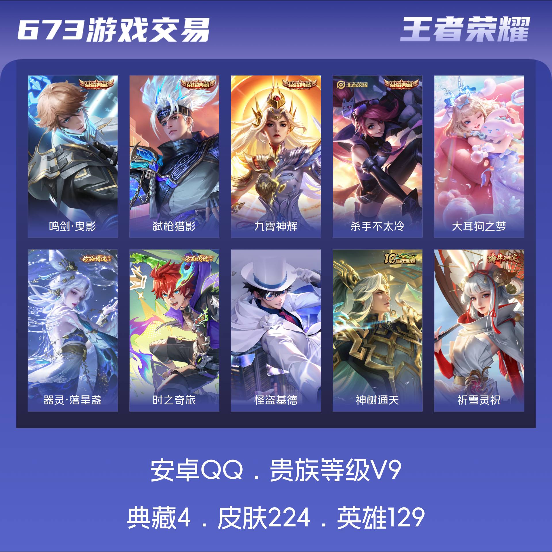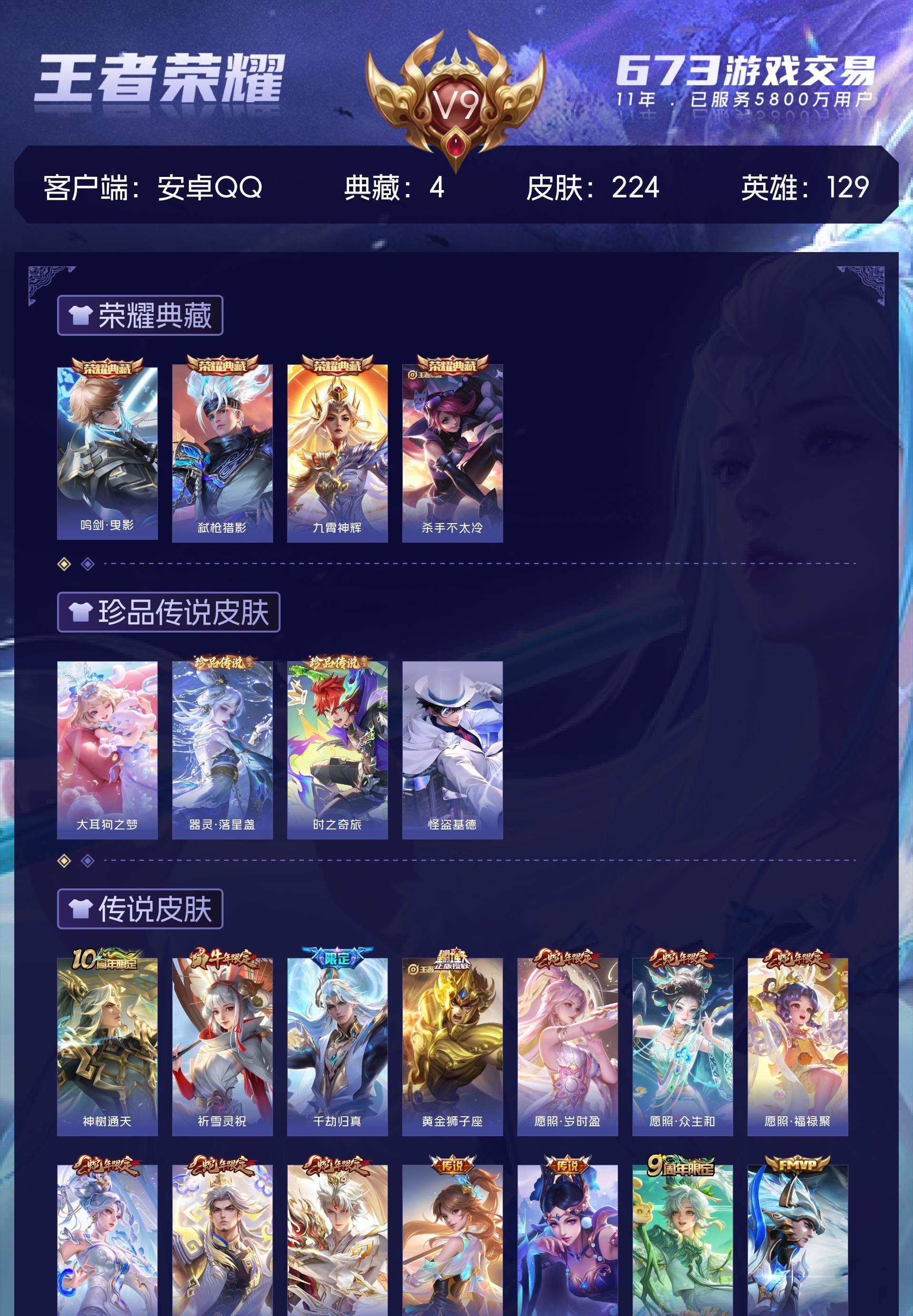 V9 皮肤224 英雄129 永恒钻石 荣耀典藏4 珍品传说4 星传说3 传说32 其他皮肤189