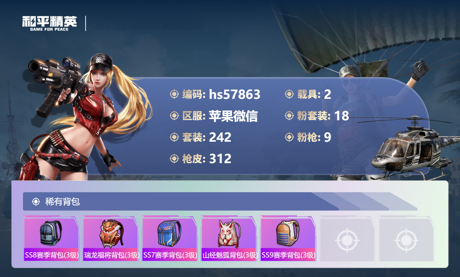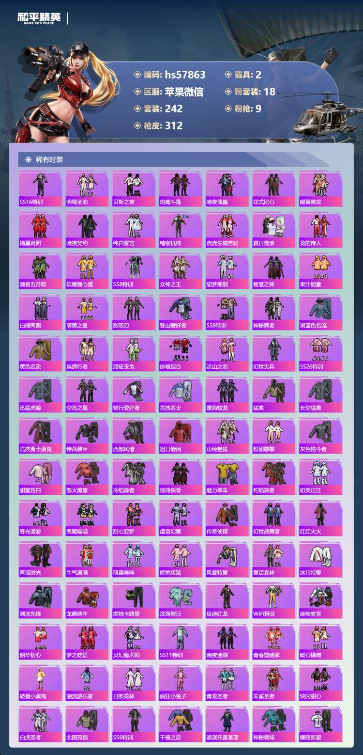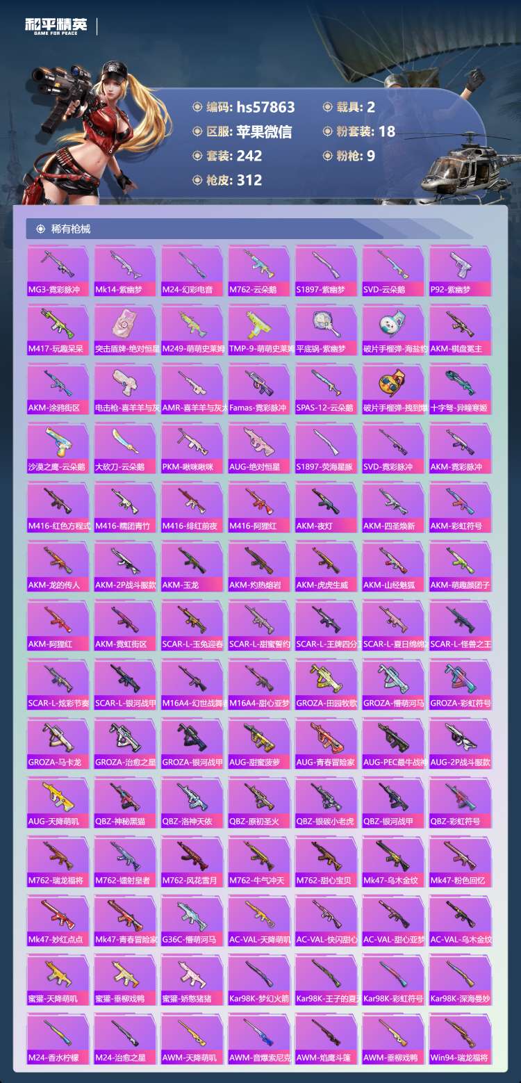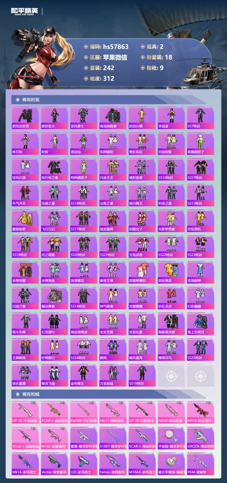 hs57863 苹果v-23王牌印记-18粉装-9特效枪-2载具-117523热力值-242套装-