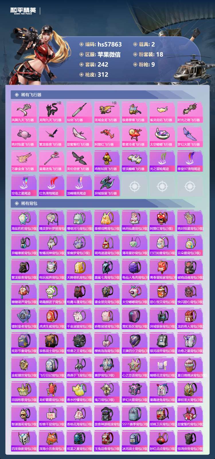 hs57863 苹果微-23王牌印记-18粉装-9特效枪-2载具-117523热力值-242套装-