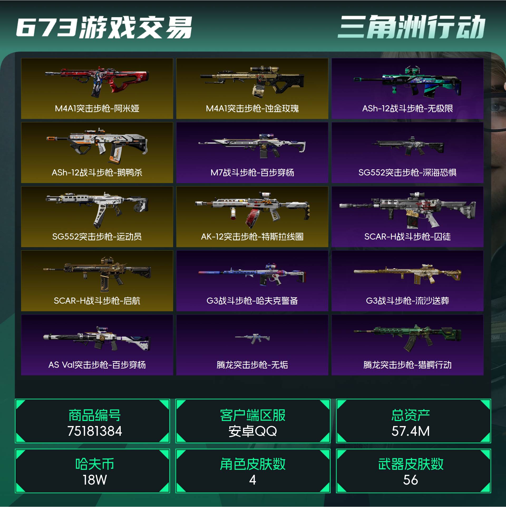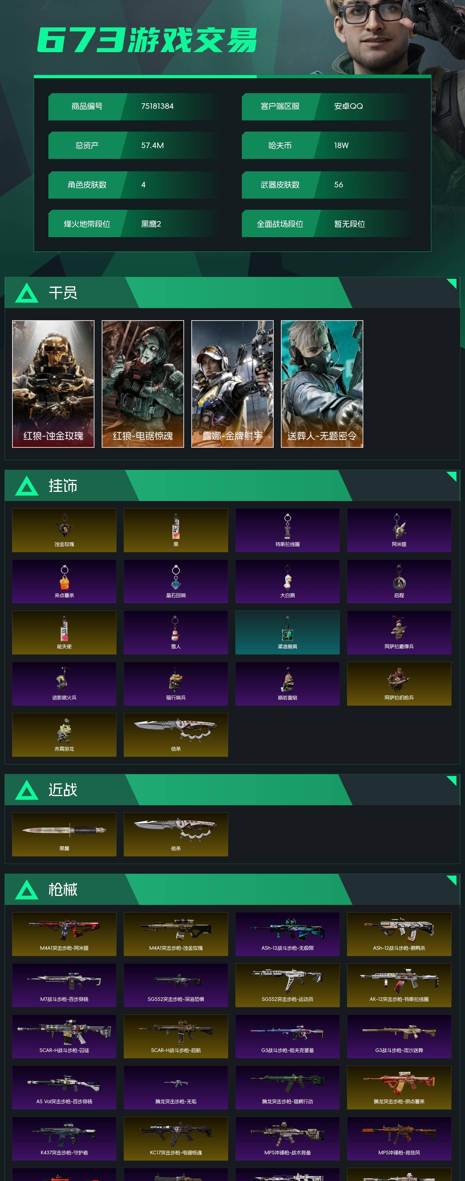 烽火段位黑鹰2 战场段位暂无段位 总资产57.4M 哈夫币18W 干员4 挂饰18 近战2 枪械56 载具38