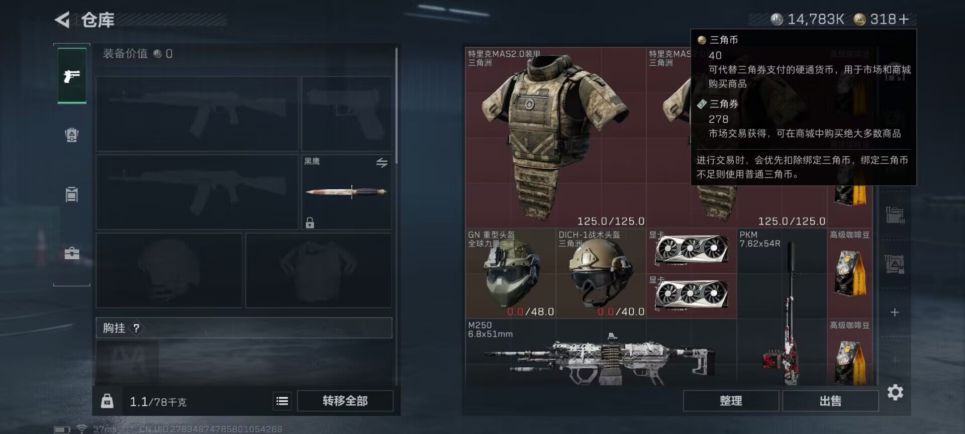 【SJZG3049】总资产(M):114M/哈夫币(K):14783K/哈夫币(K):14783K/传说枪皮数:5/全面战场等级:39_段位:军士长/烽火地带等级:58_段位:黑鹰/红狼-蚀金玫瑰/骇爪-维什戴尔/红狼-电锯惊魂/近战-黑鹰/M4A1突击步枪-蚀金玫瑰/SCAR-H战斗步枪-启航/CAR-15突击步枪-阿米娅/KC17突击步枪-电锯惊魂/R93狙击步枪-维什戴尔/PTR-32突击步枪-工业狂潮/MP5冲锋枪-战术竞备/MP5冲锋枪-竞技风/M700狙击步枪-哈夫克警备/PTR-3