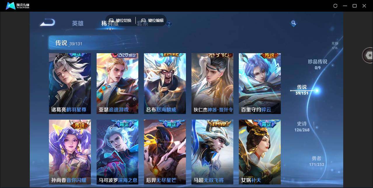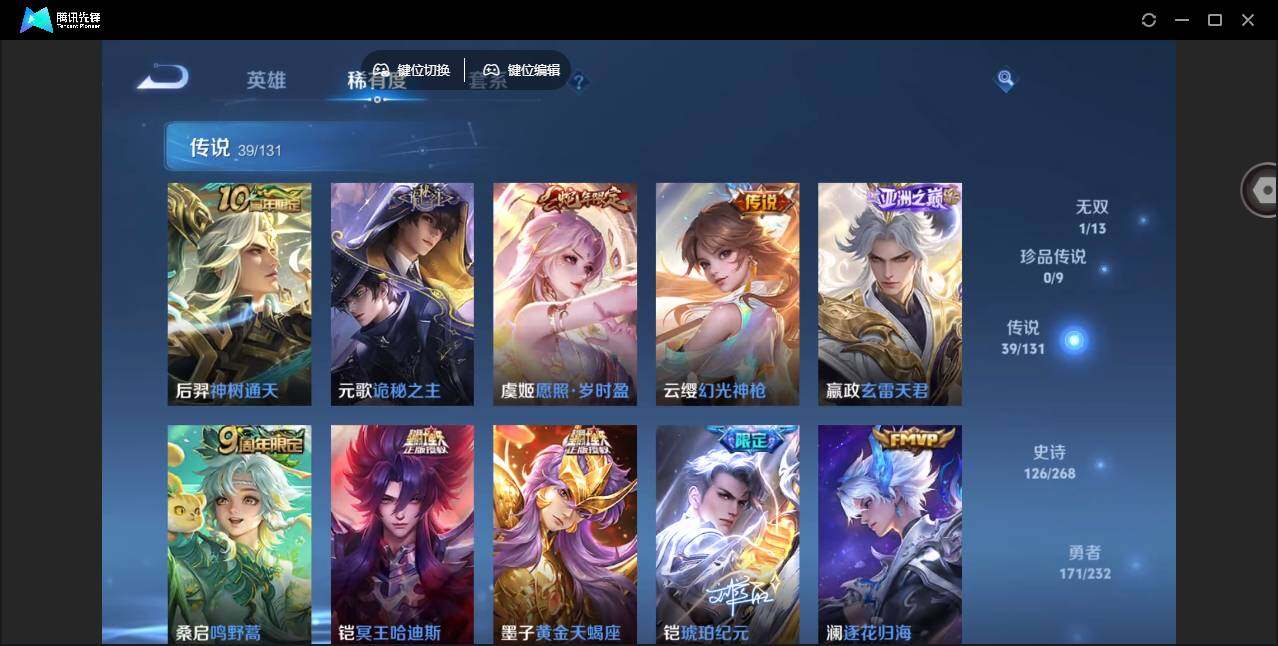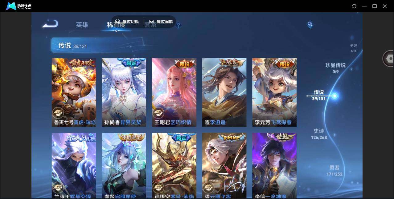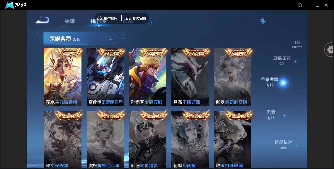 2010288 36个按键 限定皮肤多 安卓Q-V9-永恒钻石IV段位-127英雄-418皮肤-3典藏皮肤-1无双-39传说-126史诗