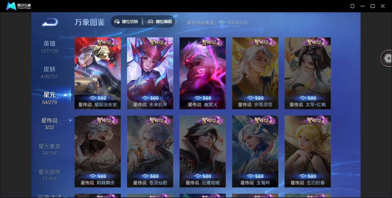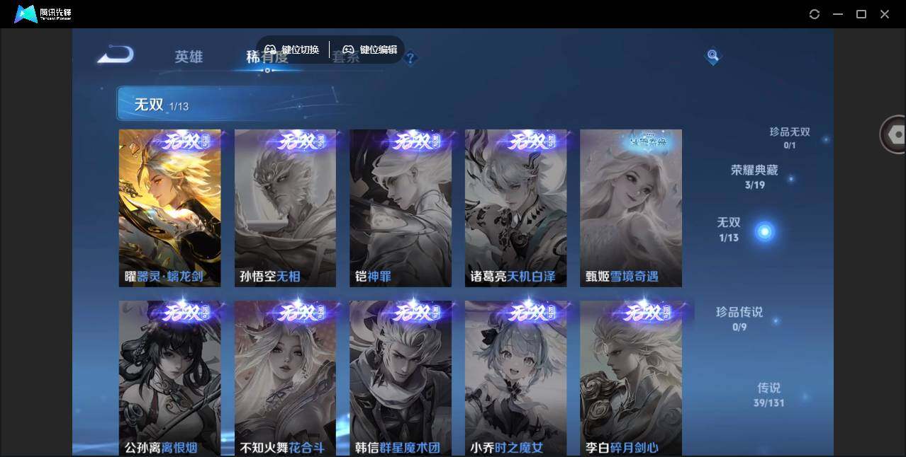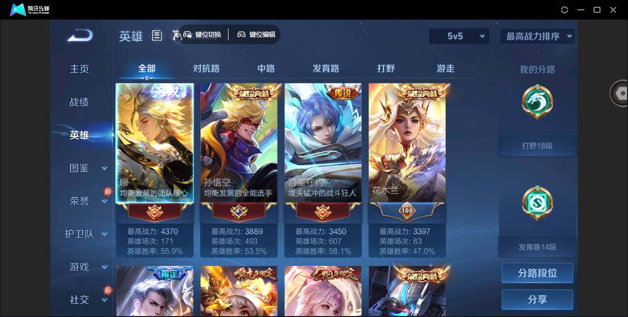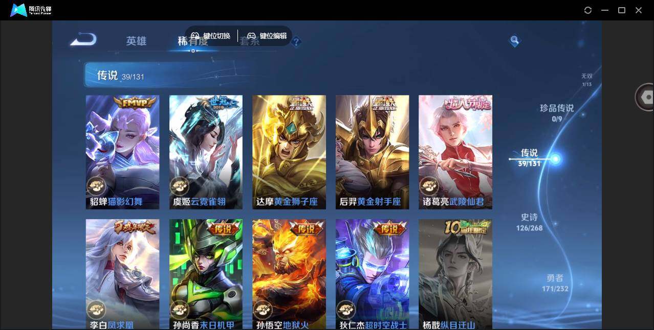 2010288 36个按键 限定皮肤多 安卓Q-V9-永恒钻石IV段位-127英雄-418皮肤-3典藏皮肤-1无双-39传说-126史诗