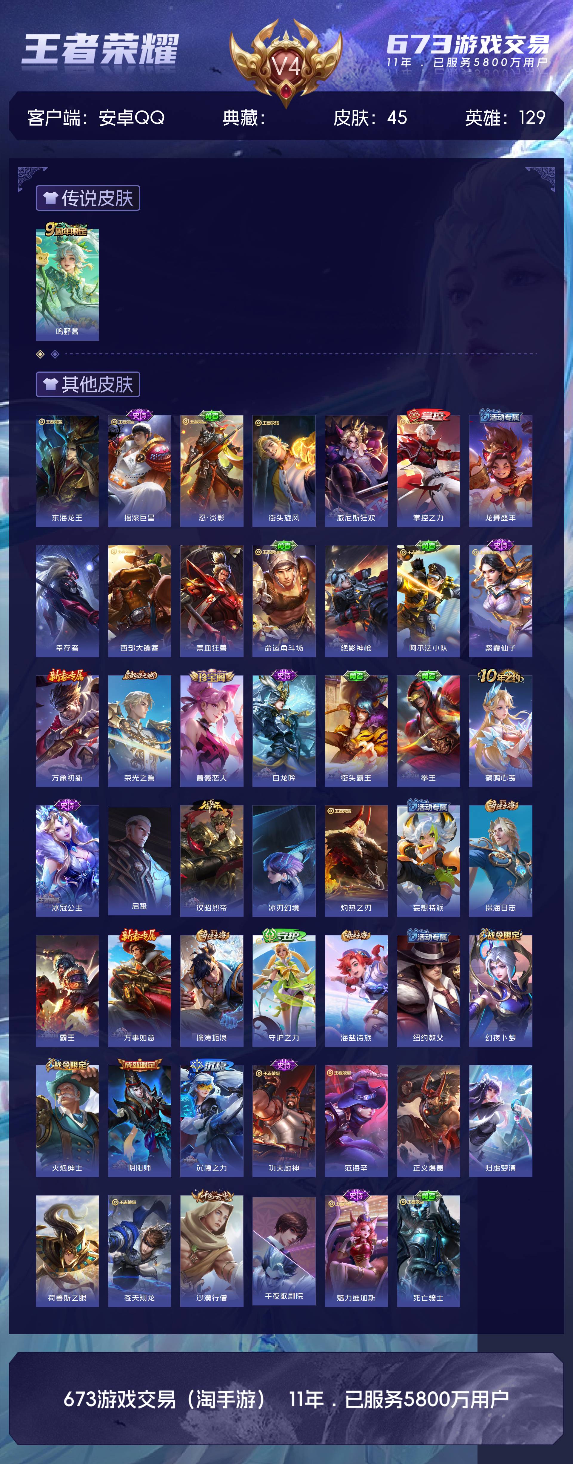 V4 皮肤45 英雄129 至尊星耀 传说1 其他皮肤48