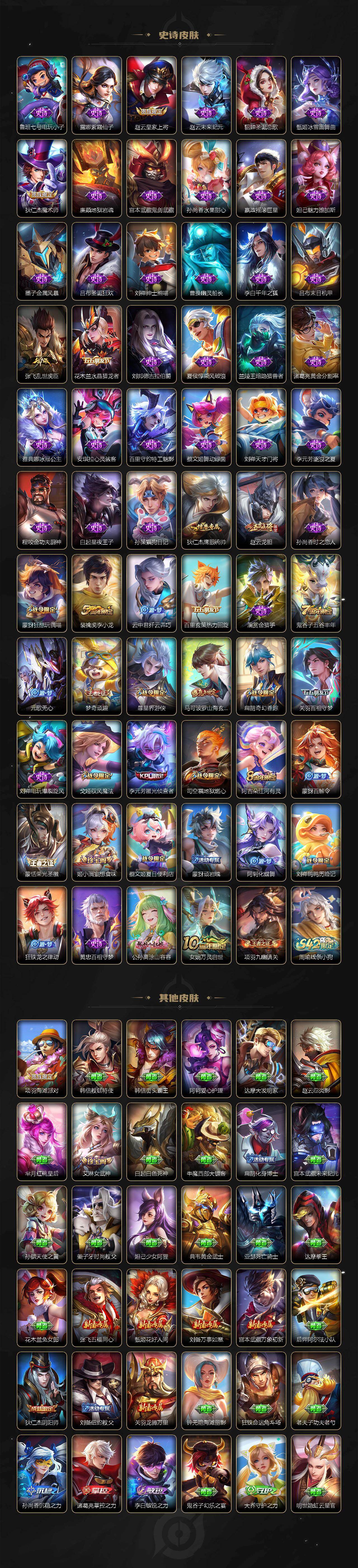 【传说皮肤】:后羿神树通天,澜愿照九州拓,云缨幻光神枪,桑启鸣野蒿,澜逐花归海,澜电玩雷克斯,花木兰燃星之曲,李信山海炽霜斩,吕布怒海麟威,镜炽阳神光