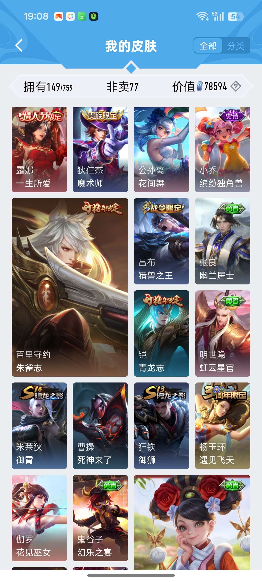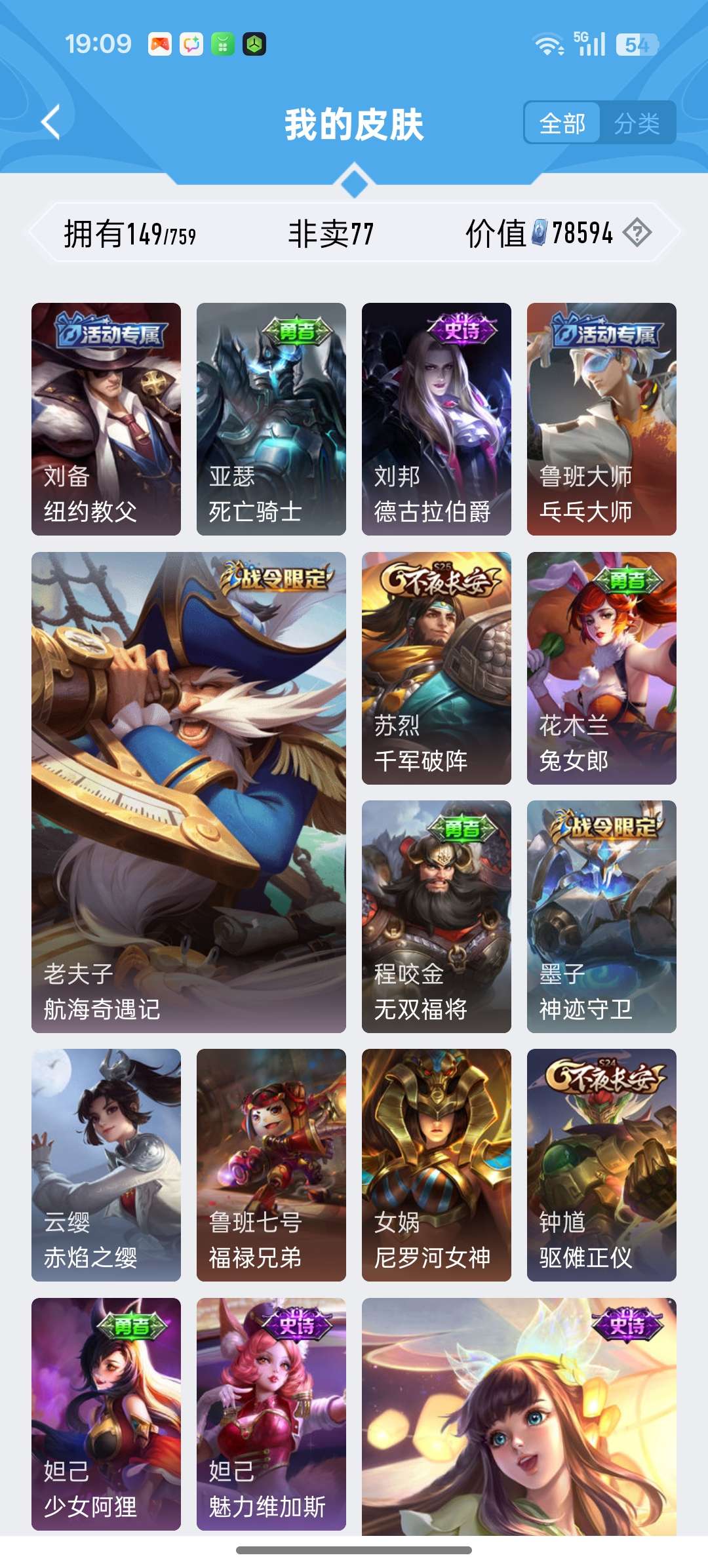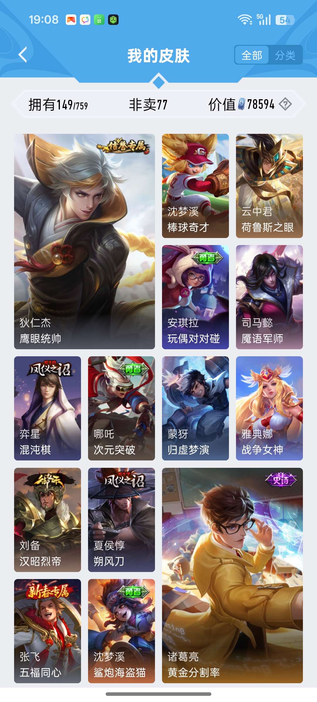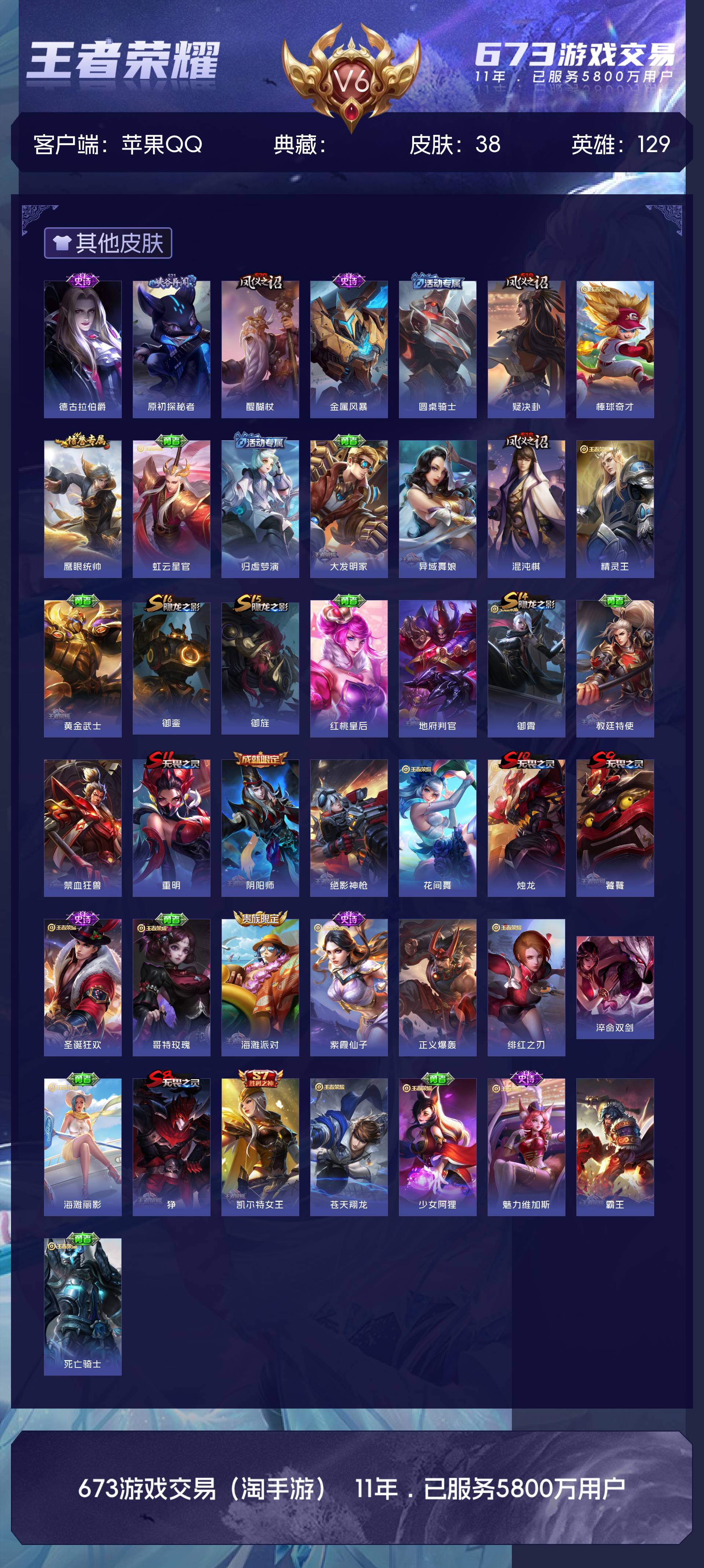 V6 皮肤149 英雄129 荣耀黄金 星传说1 其他皮肤自己看