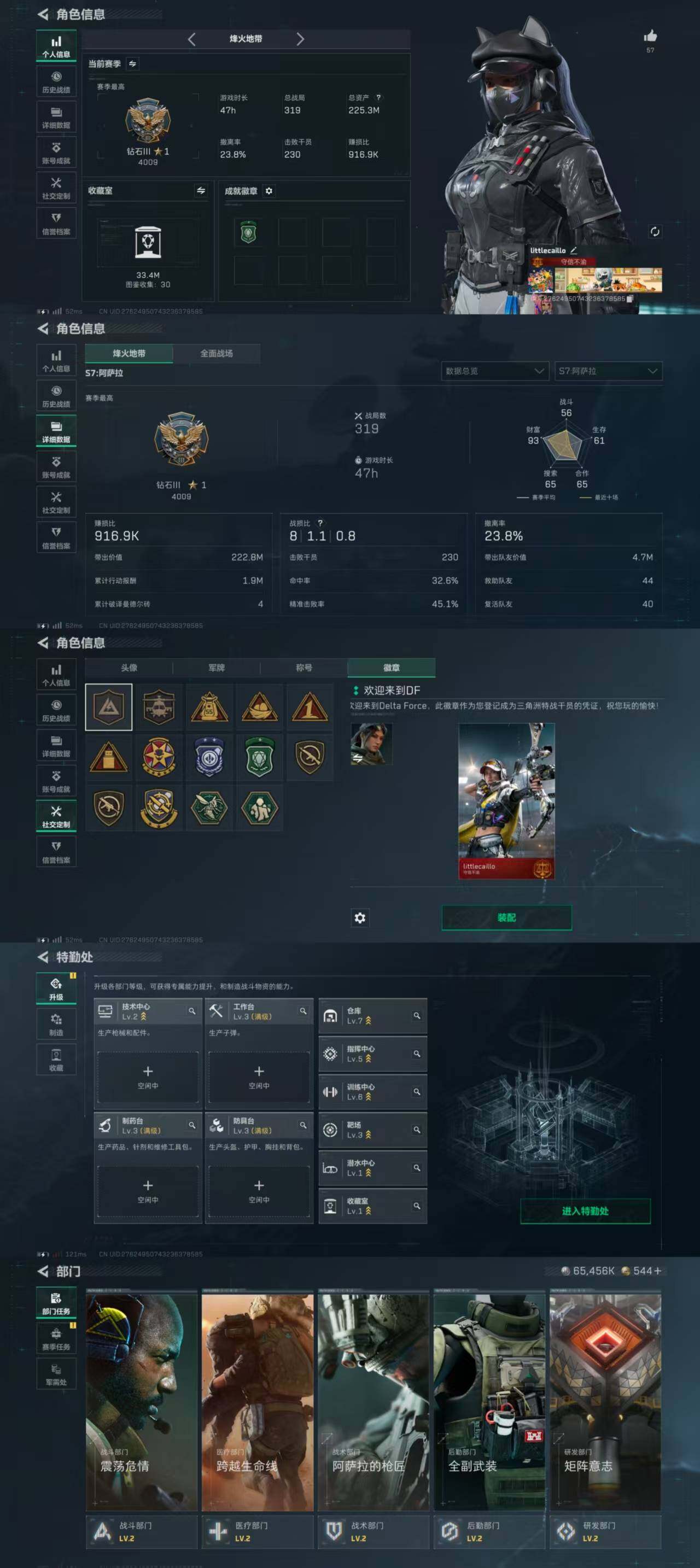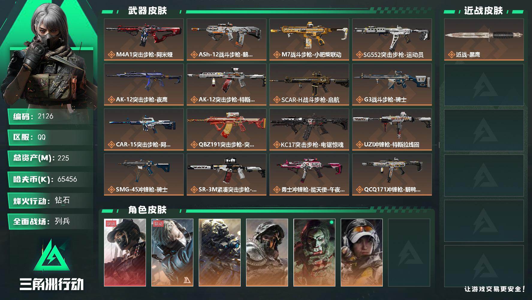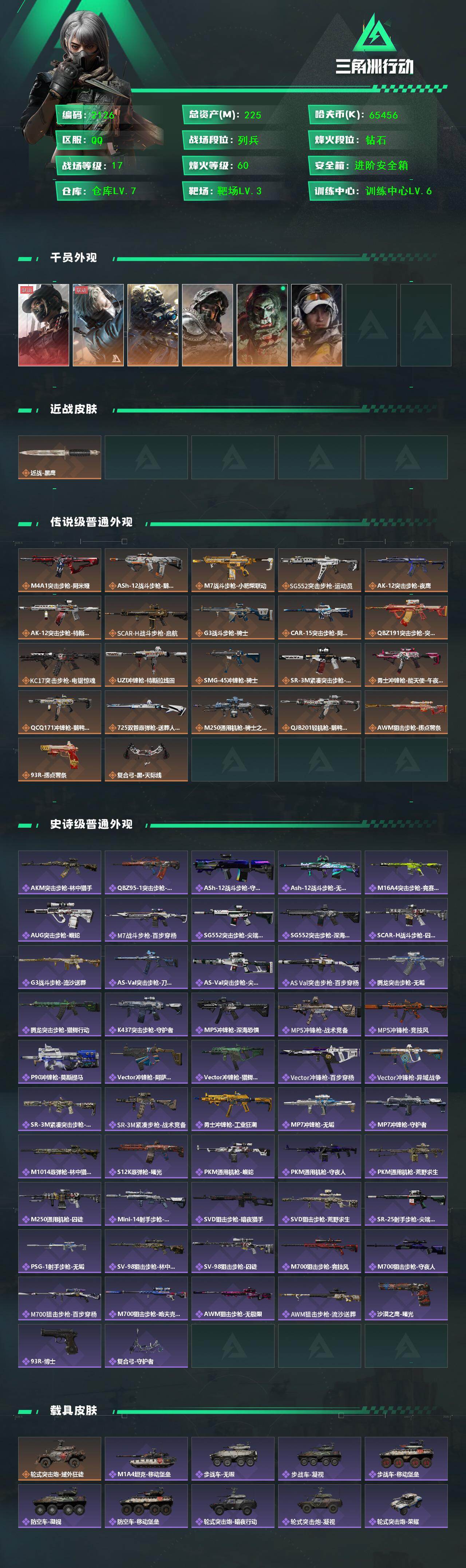 总资产(M):225M/哈夫币(K):65456K/哈夫币(K):65456K/传说枪皮数:22/全