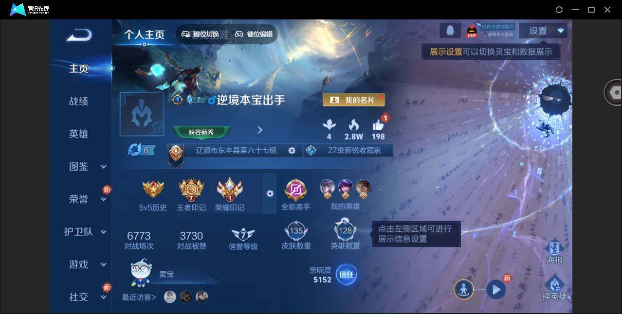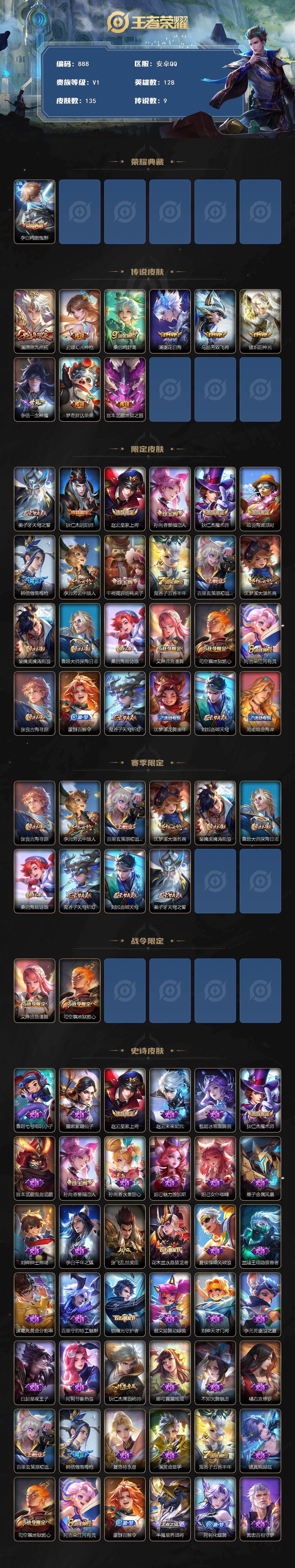 2010519 王者荣耀账号 安卓Q-V6-至尊星耀V段位-128英雄-135皮肤-1典藏皮肤-9传说-43史诗