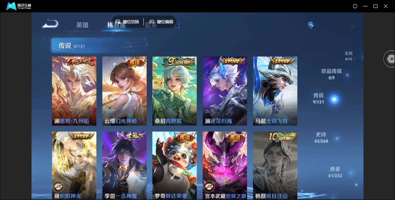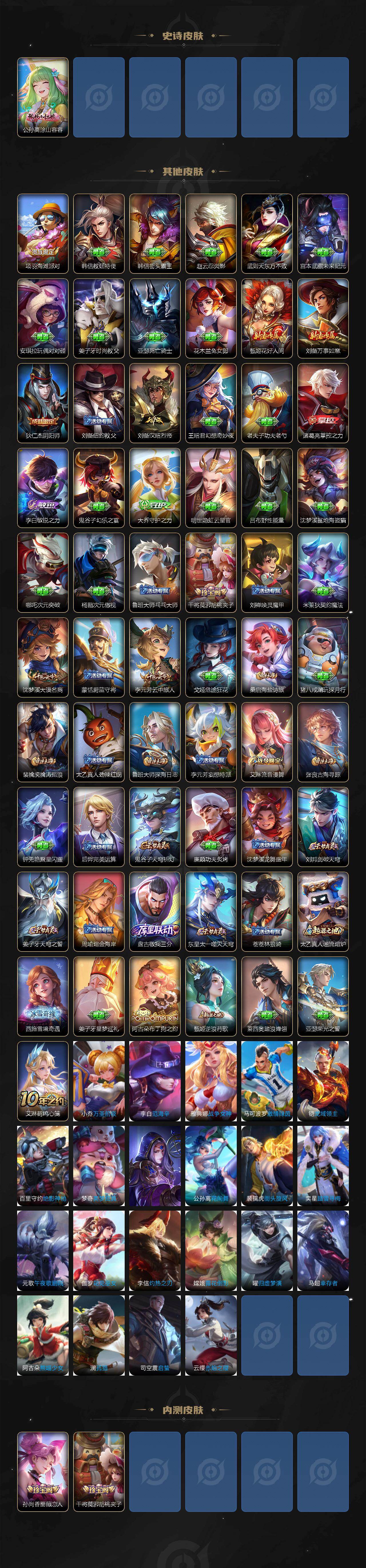 【传说皮肤】:澜愿照九州拓,云缨幻光神枪,桑启鸣野蒿,澜逐花归海,马超无双飞将,镜炽阳神光,李信一念神魔,梦奇胖达荣荣,宫本武藏地狱之眼