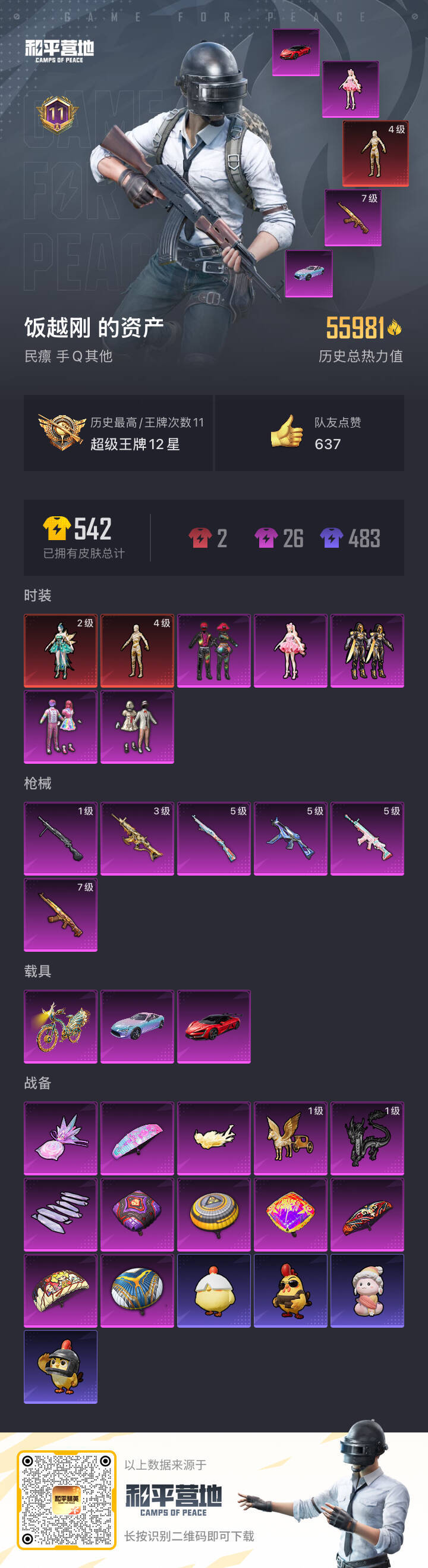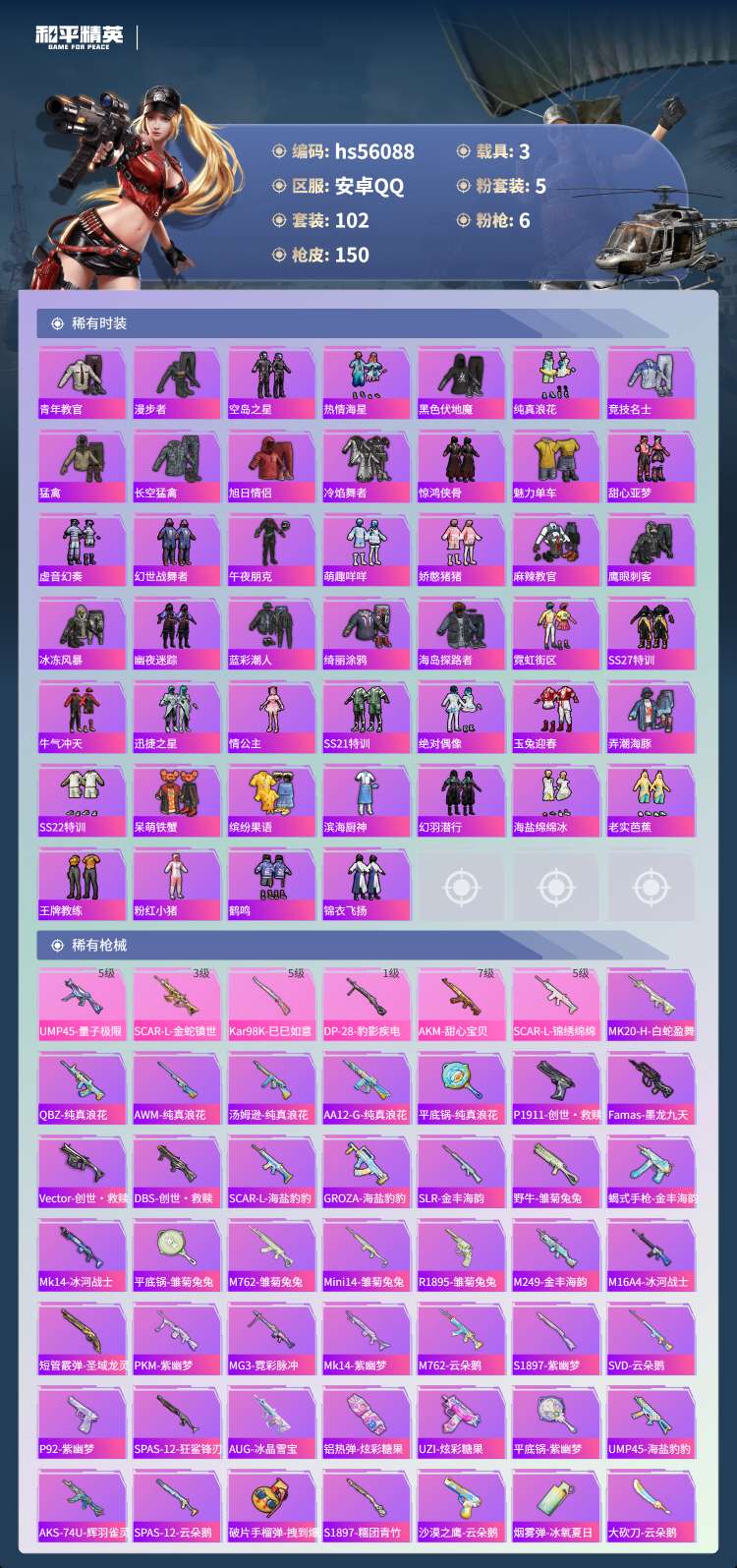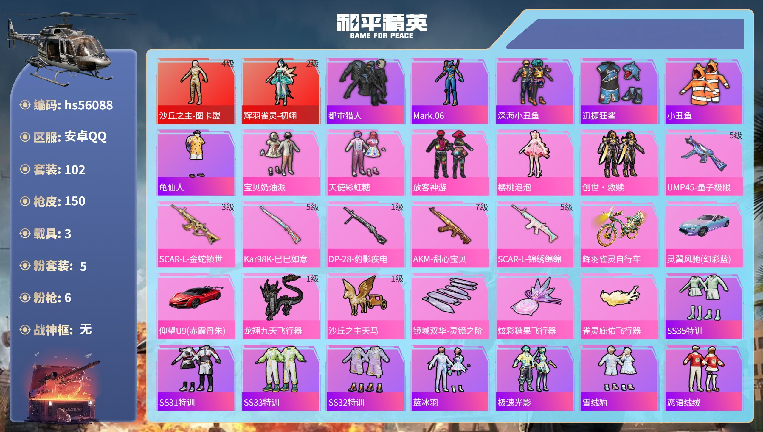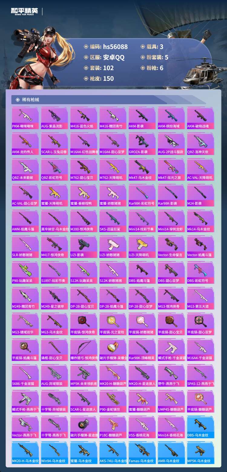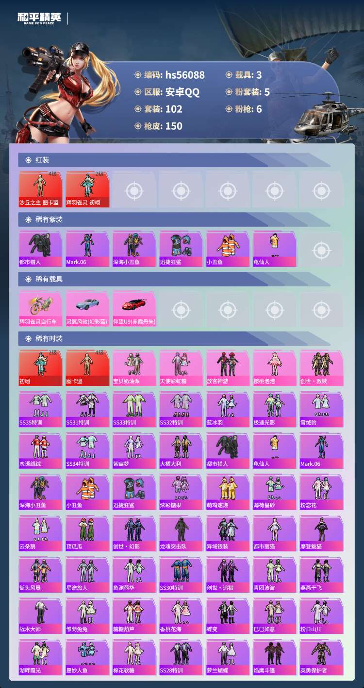 安卓Q-2红装2稀有3载具5粉装6特效枪11热门102套装150枪皮 55981热力值 11印记 历