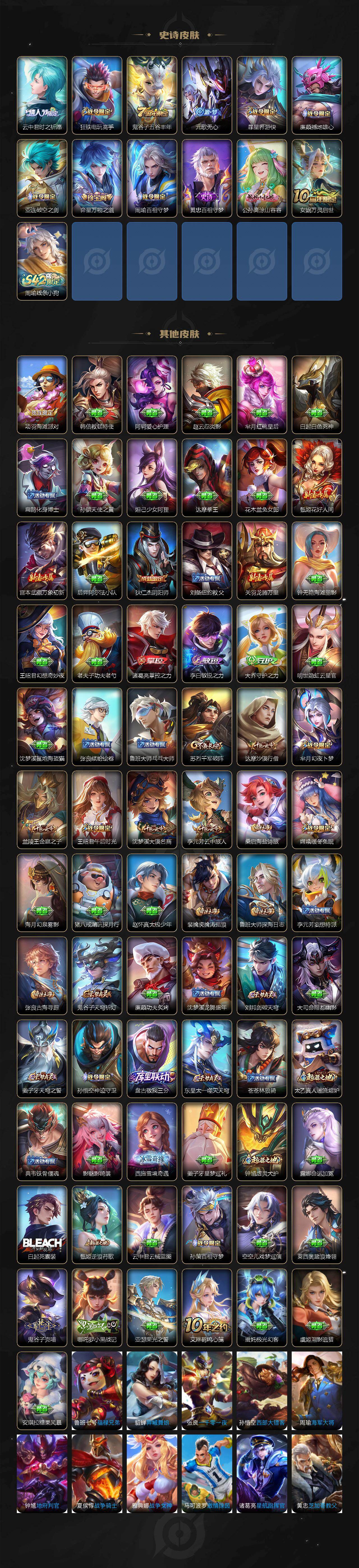 【传说皮肤】:后羿神树通天,桑启鸣野蒿,瑶时之祈愿,西施游龙清影,貂蝉猫影幻舞,后羿黄金射手座,貂蝉仲夏夜之梦,孙悟空地狱火