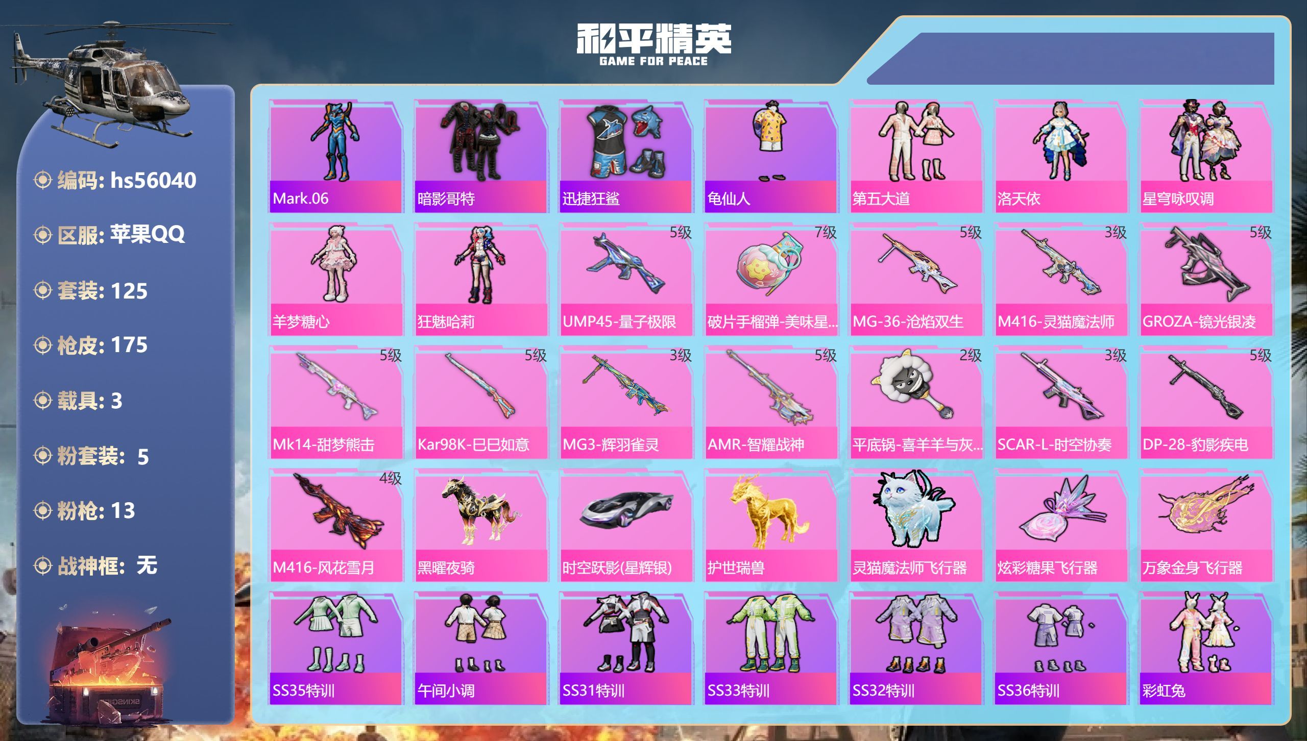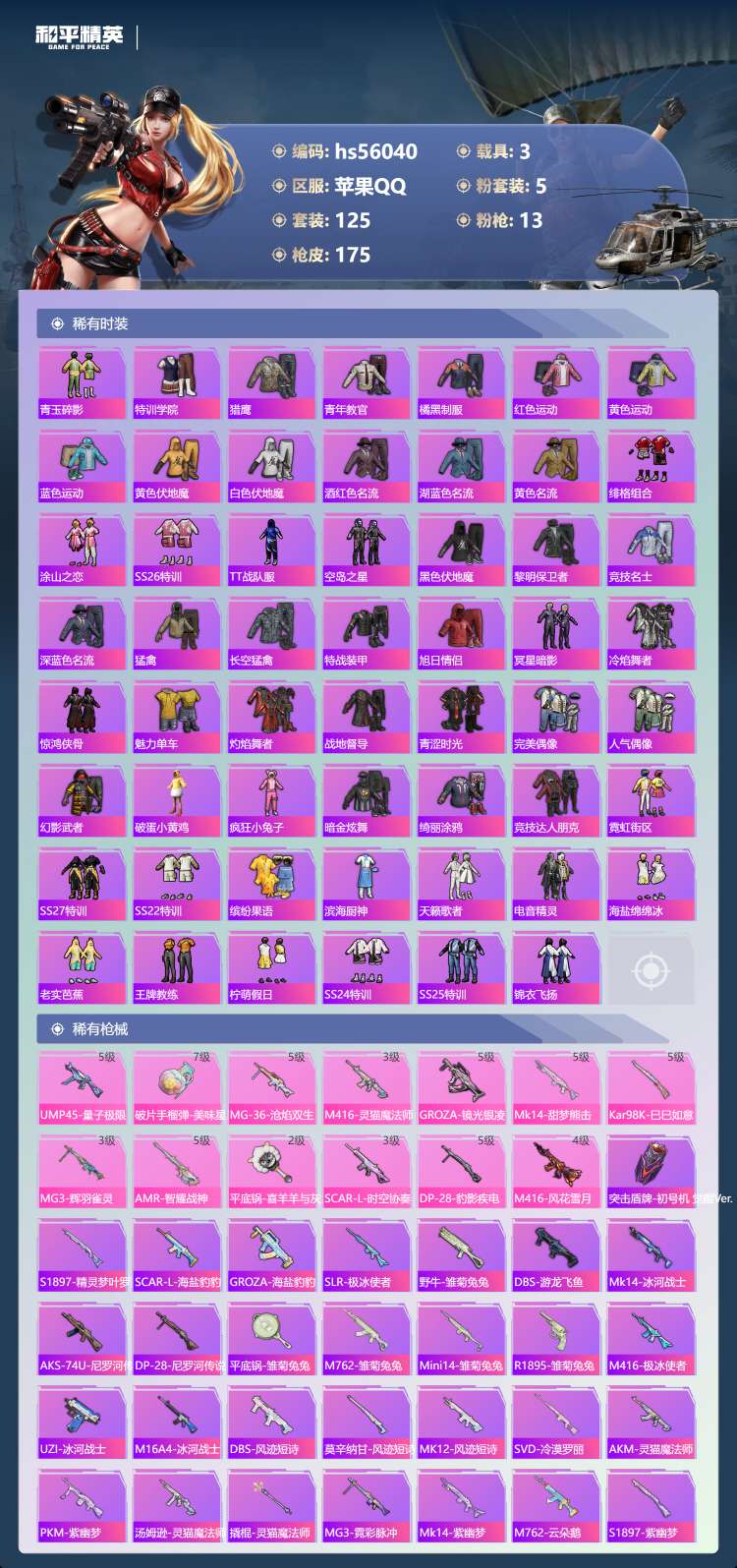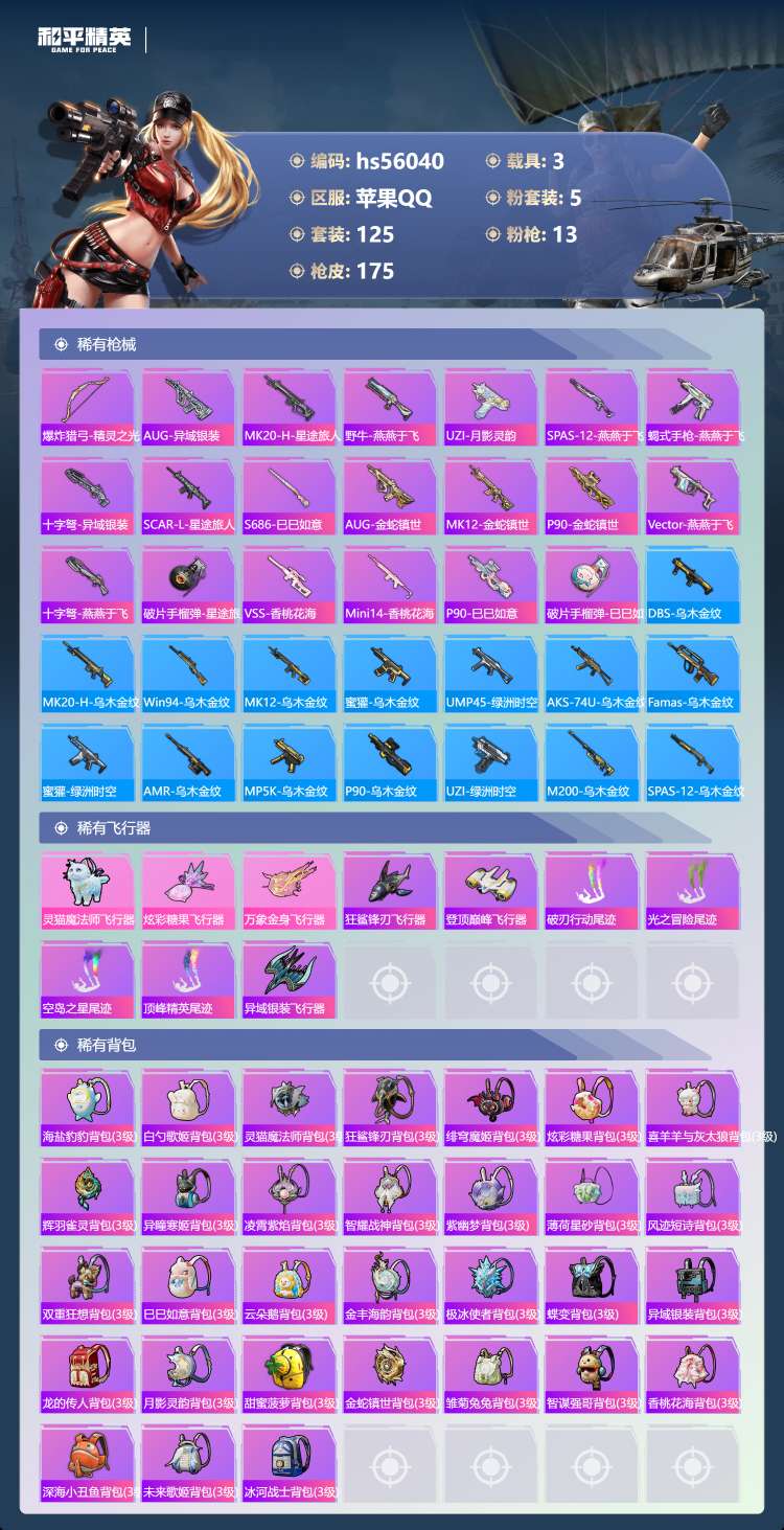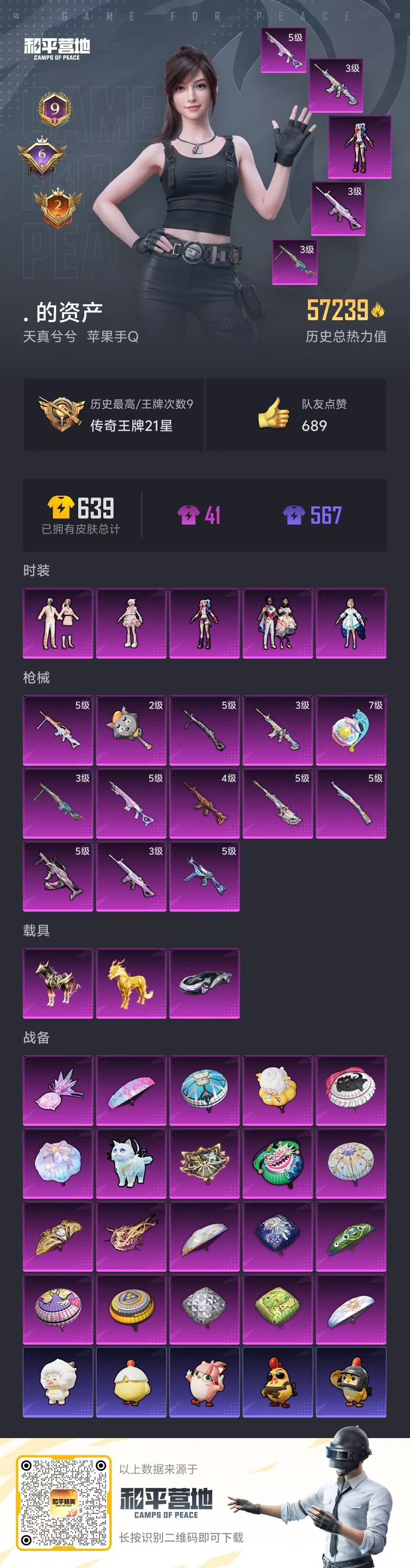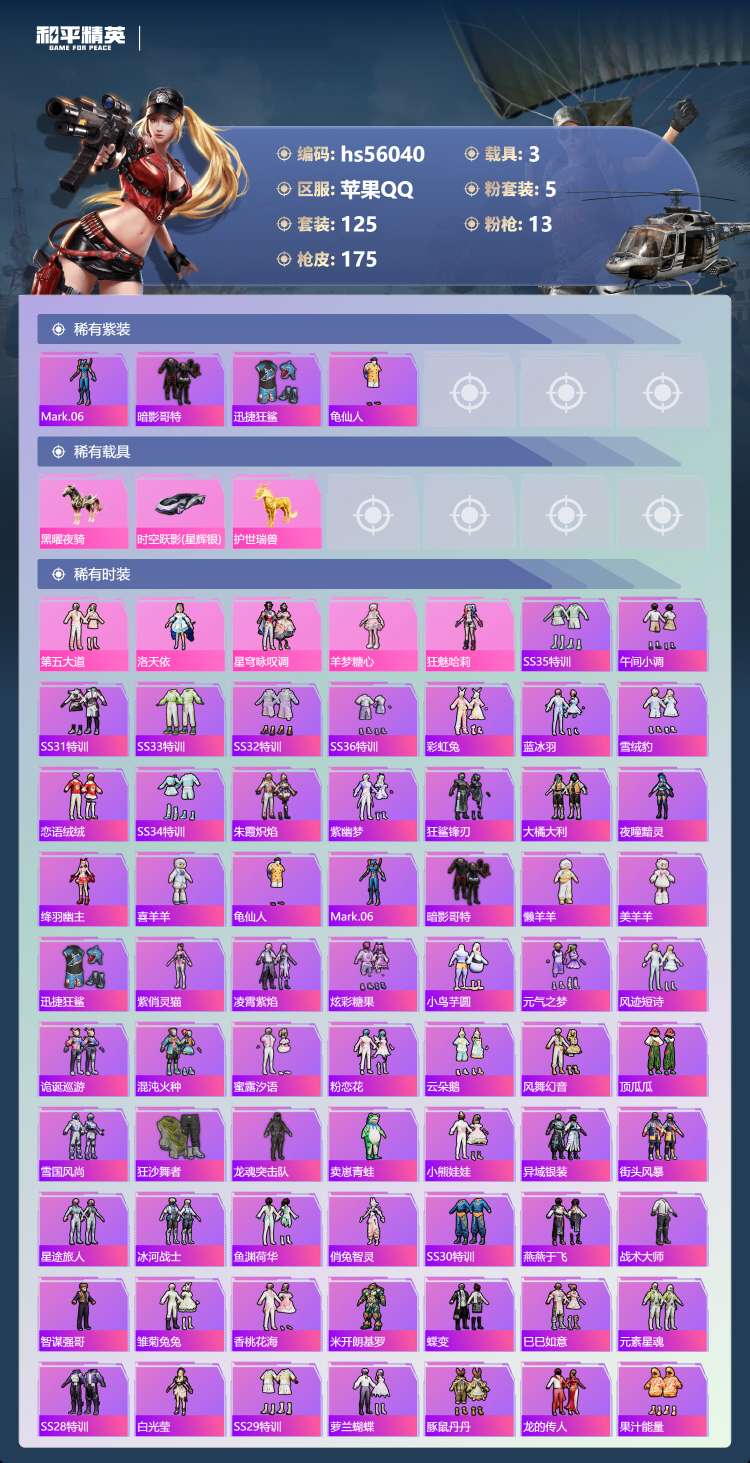 苹果Q-3载具5粉装12特效枪9热门125套装175枪皮 57239热力值 9印记 历史传奇王牌21