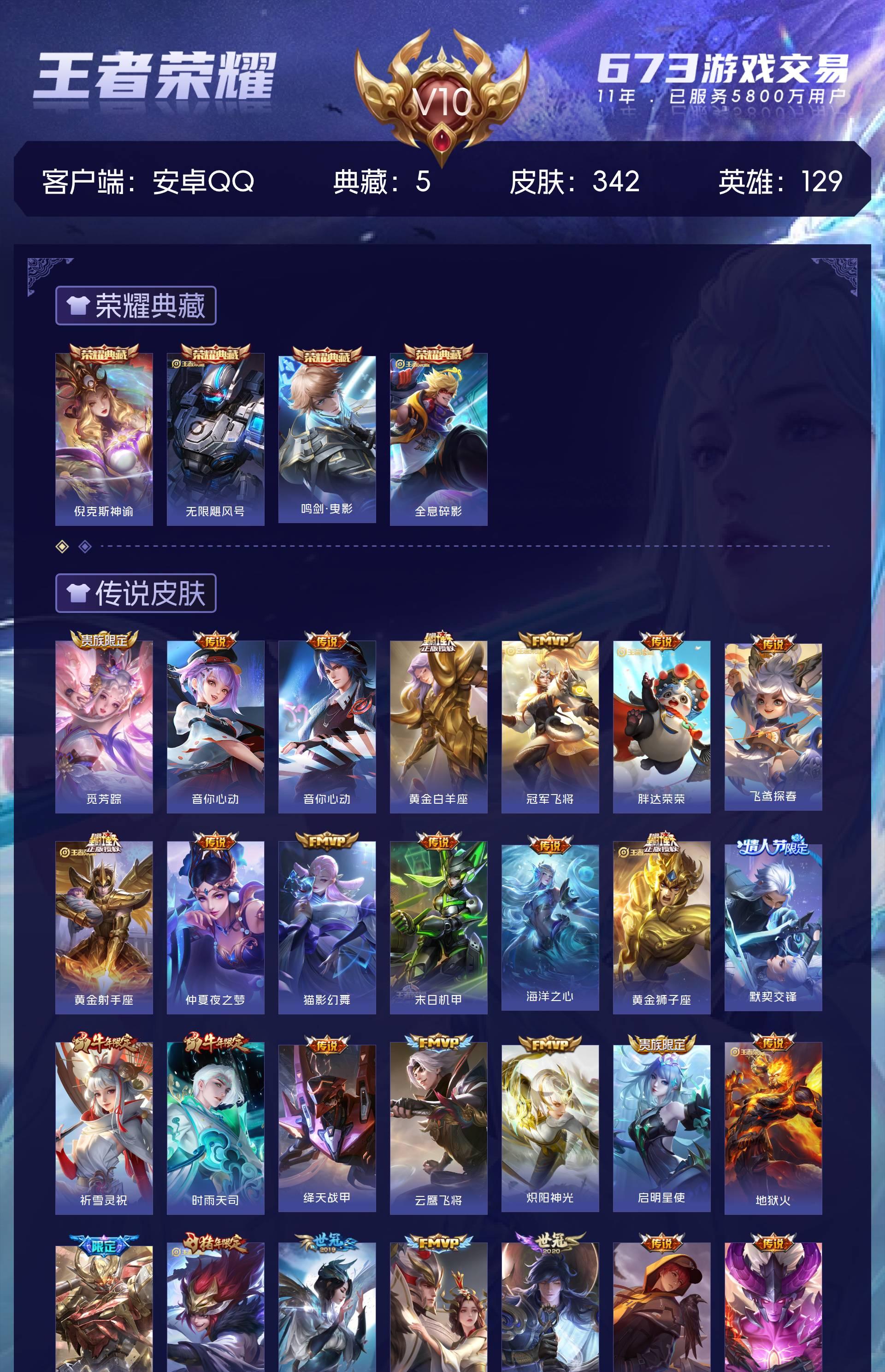 V10 皮肤342 英雄129 尊贵铂金 荣耀典藏5 传说30 其他皮肤314