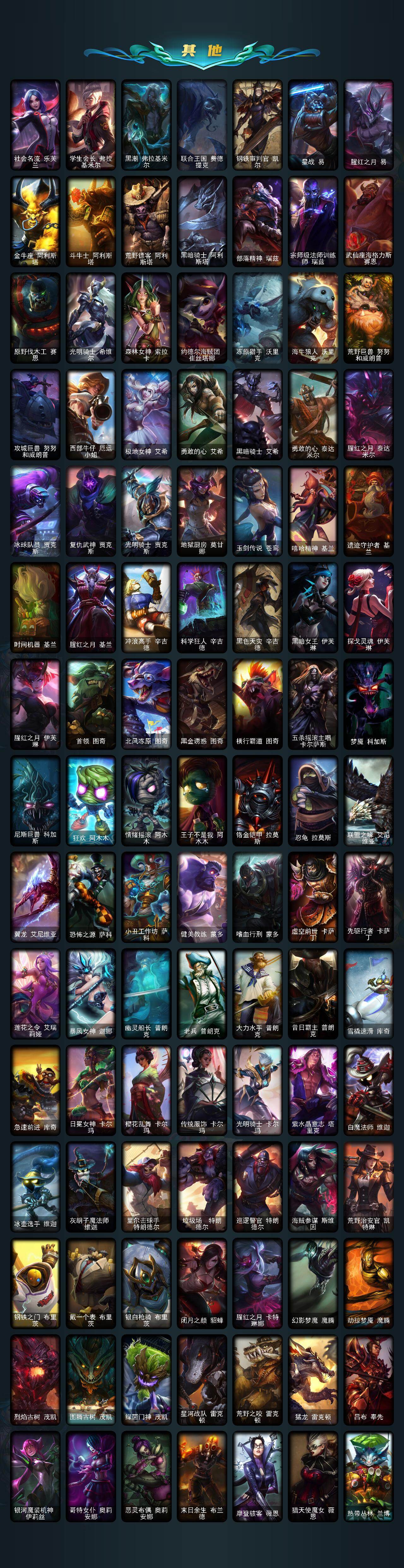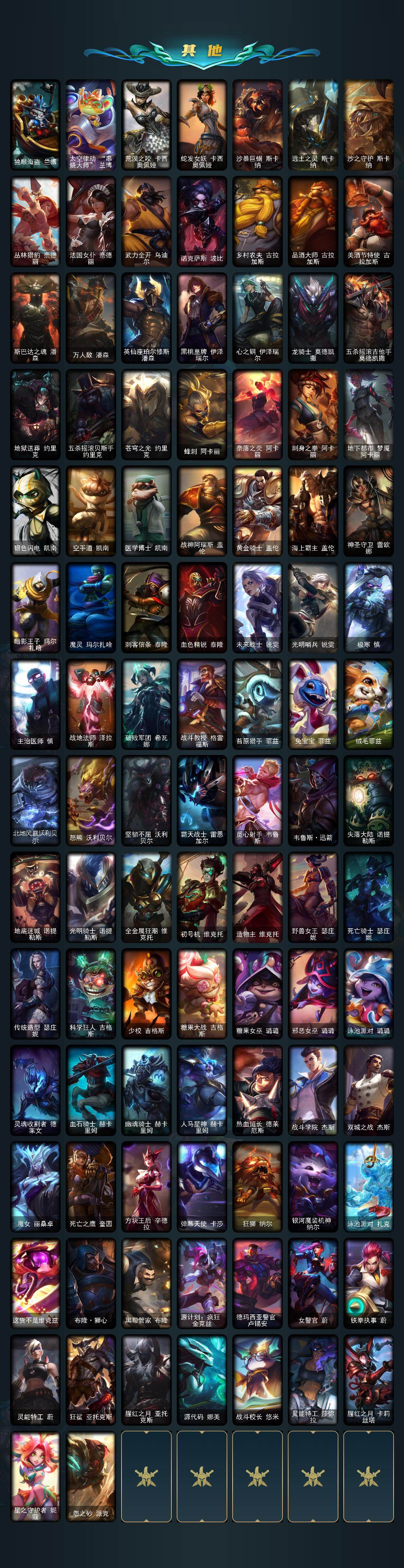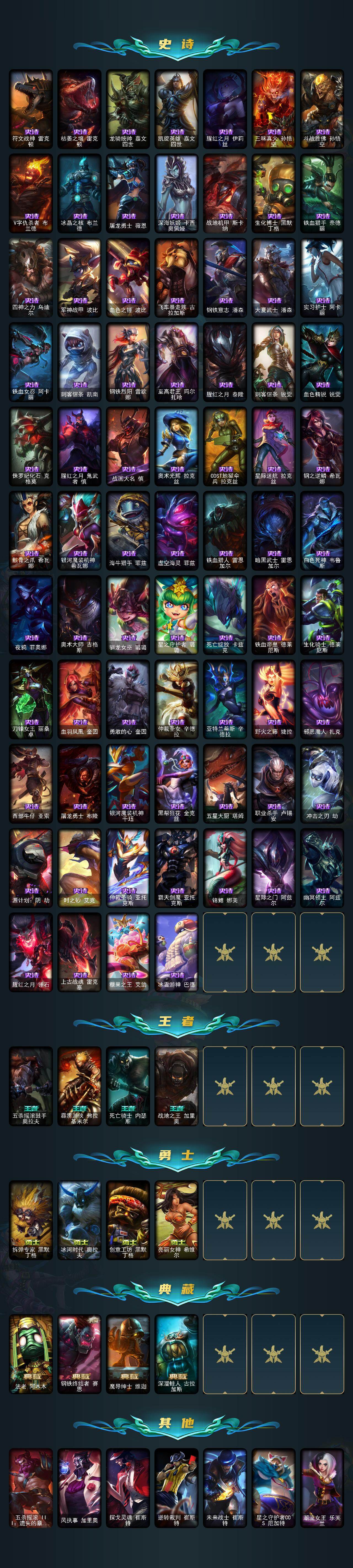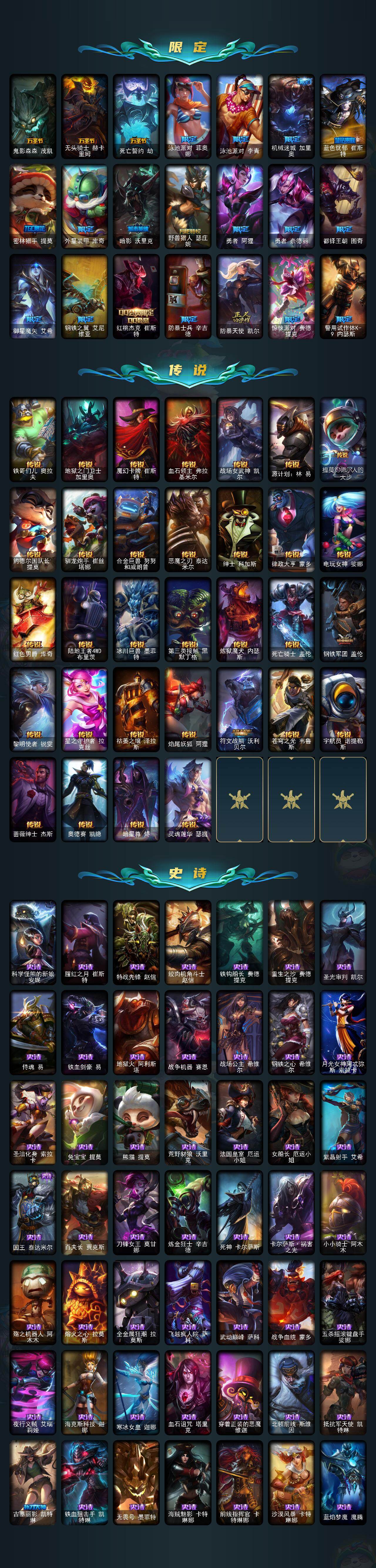172英雄/465皮肤/6神话/79限定/5臻彩/87炫彩/32传说/123史诗