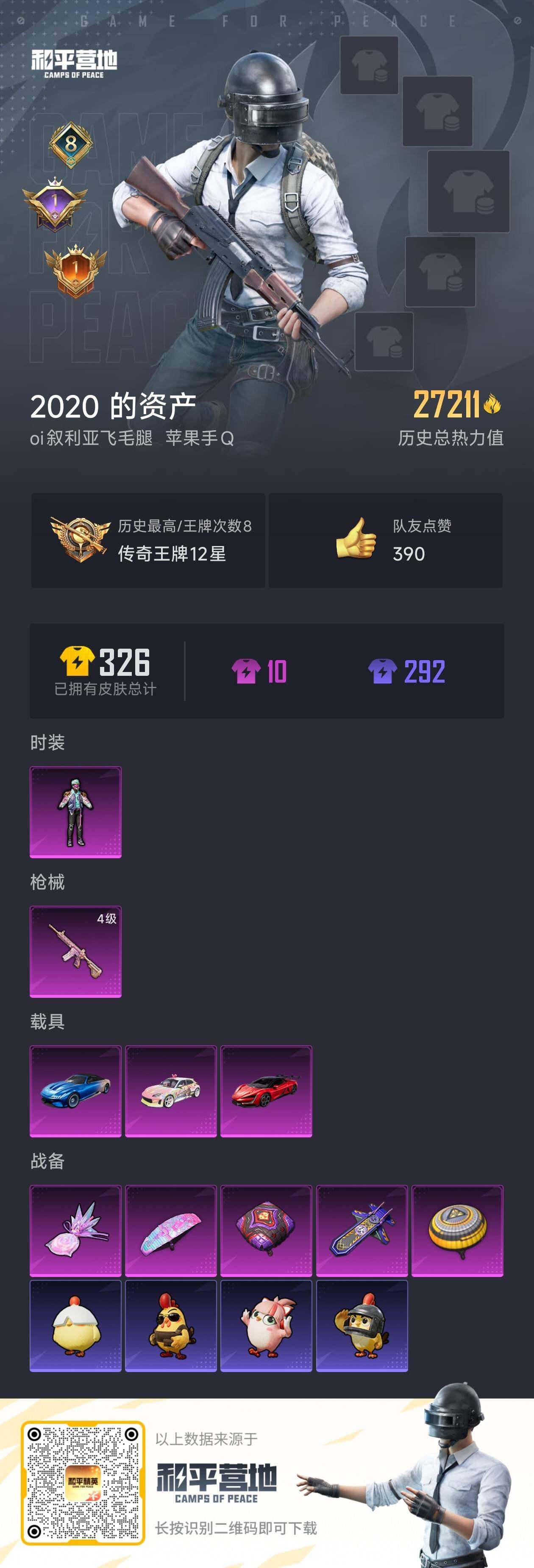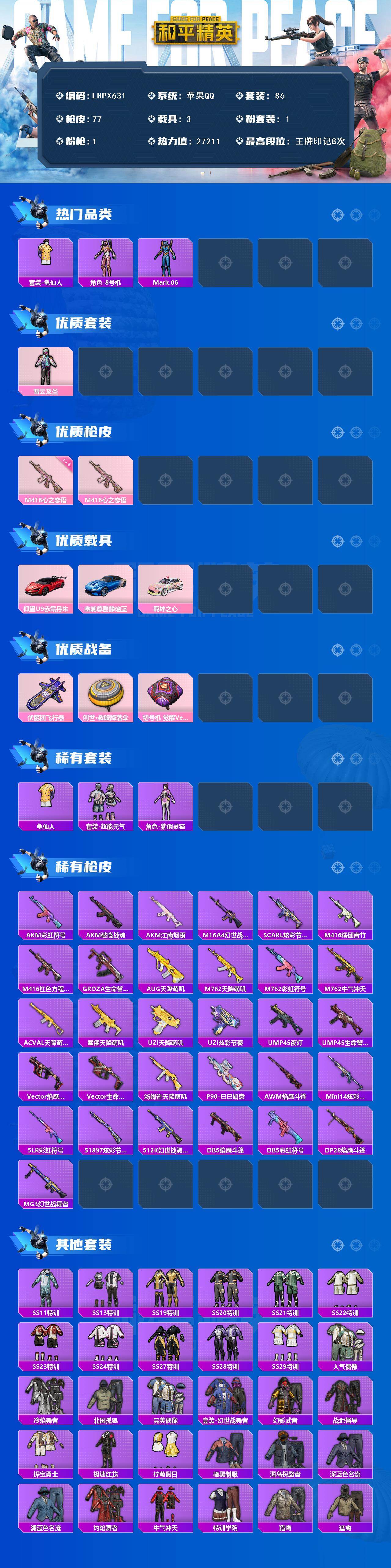【特价出售/店主推荐】苹果 手Q-1粉装-1特效枪-3载具-2粉色飞行器-2.7w热力值-8王牌印记-86套装-77枪皮
