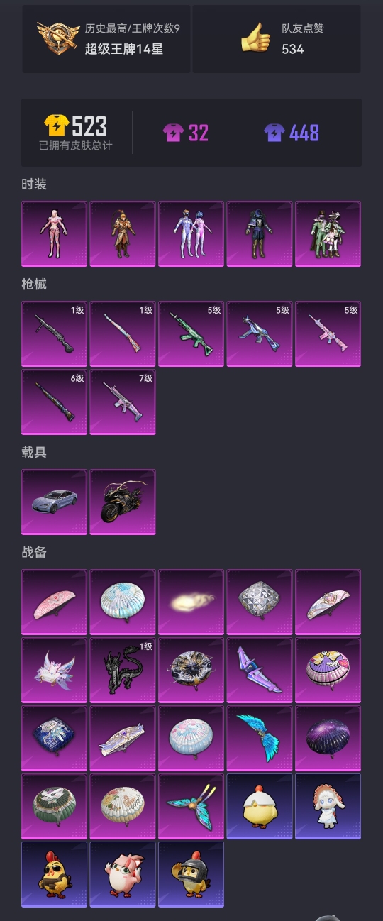 976-【梦幻火箭7特效枪2载具5粉装、秒换绑不用等】、安卓Q区-49518热力值-9印记-93套装-136枪皮、【2载具】、仰望U7先锋版(阿盖尔紫)、疾风龙骑【5粉装】、梦幻火箭、齐天大圣、星之信仰、精灵迷巫、角色-守护天翼【7特效枪】、SCAR-L-梦幻火箭(7级)、M24-星之信仰(6级)、M762-青锋波束(5级)、Kar98K-巳巳如意(1级)、M416-电玩时刻(5级)、DP-28-豹影疾电(1级)、UMP45-量子极限(5级)【41热门】、潮萌小黄鸭、奇迹天团、M416-仓鼠灰灰