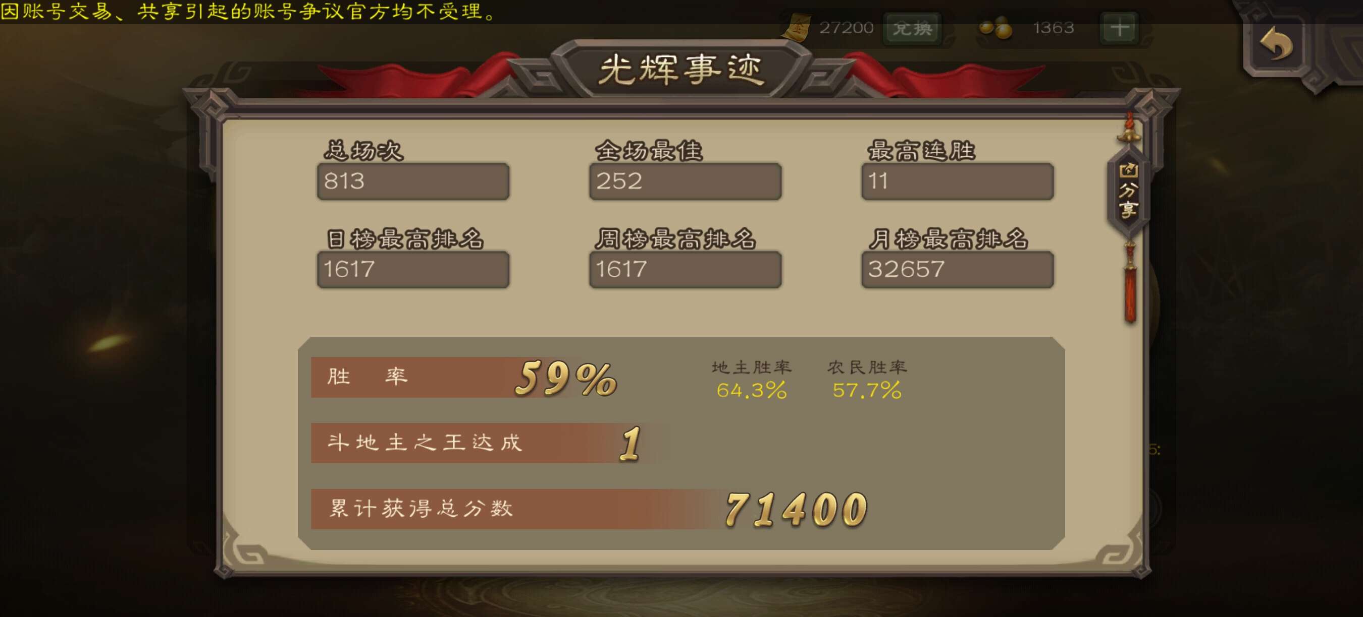 官服59斗地主胜率斗王号,告别胜率歧视,许攸友徐庶老沙界钟会,23宝珠可换大宝星黄忠,卡一等中军官阶