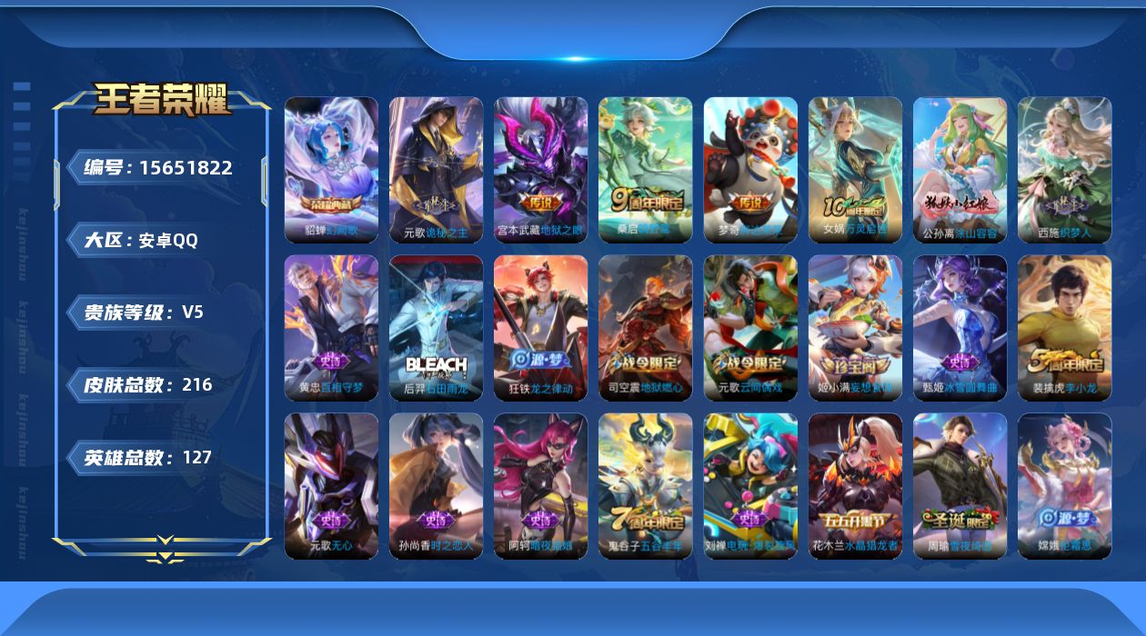 [15651822]V5 1典藏 4传说 127英雄 216皮肤 可修改实名 万战金标哪吒