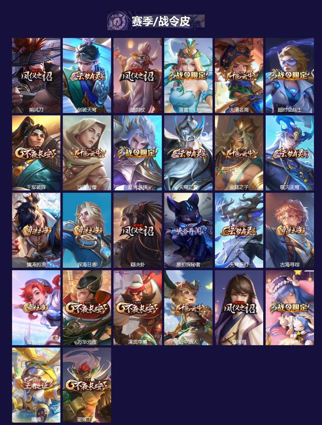 【赛季/战令皮】噬灭天穹(s37),古海寻踪(s33),星界游侠,海盐诗旅(s30),擒涛扼浪(s31),探海日志(s32),顽趣-梦奇,
