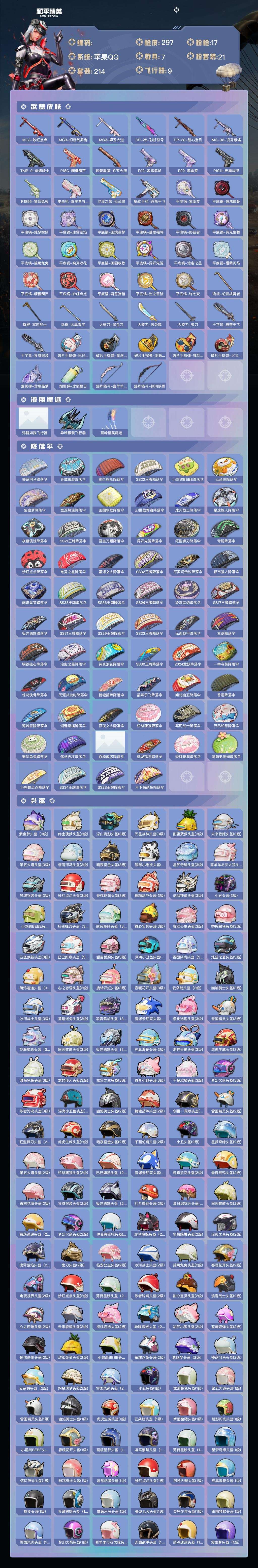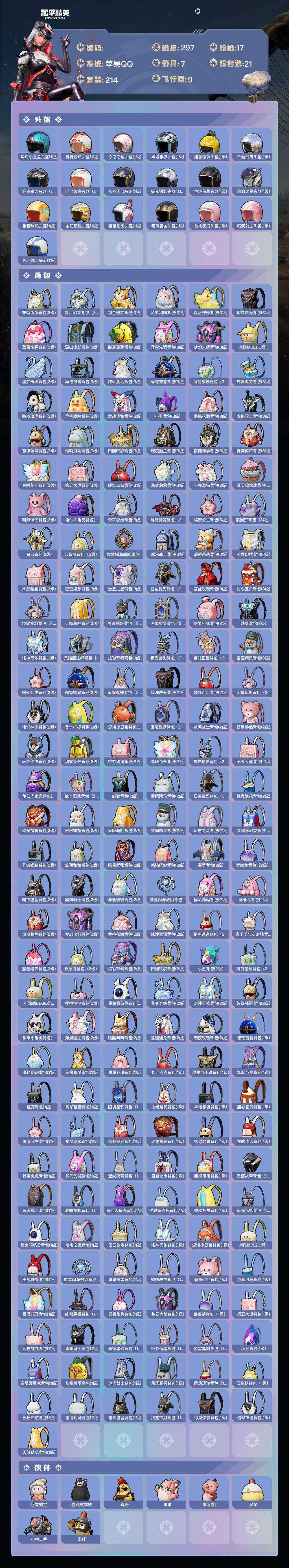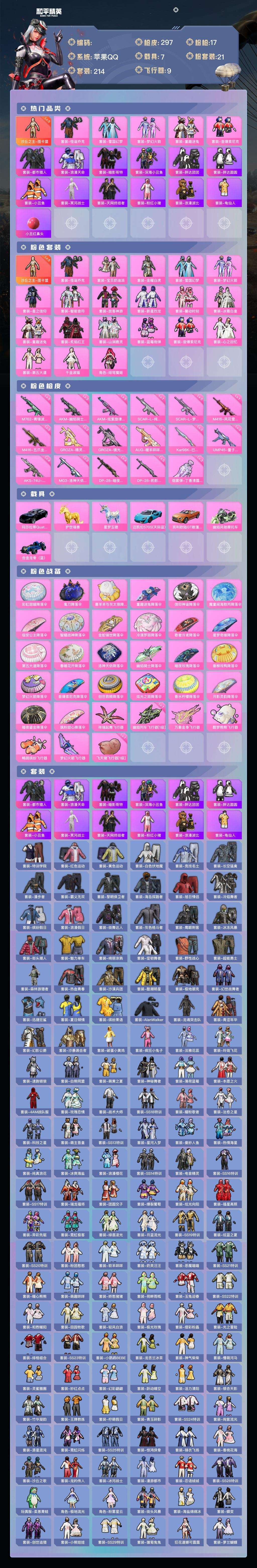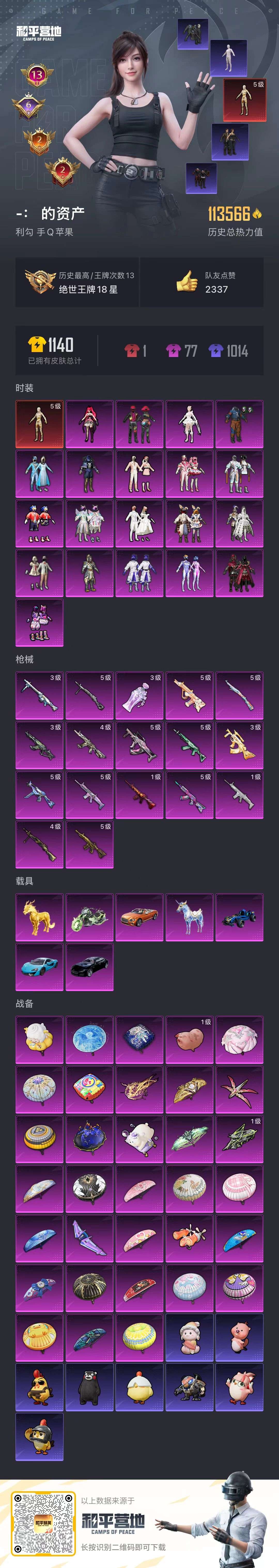 a4223/苹果QQ/热力值:113566,1神装,20粉装,17粉枪,7载具,33粉色战备,214