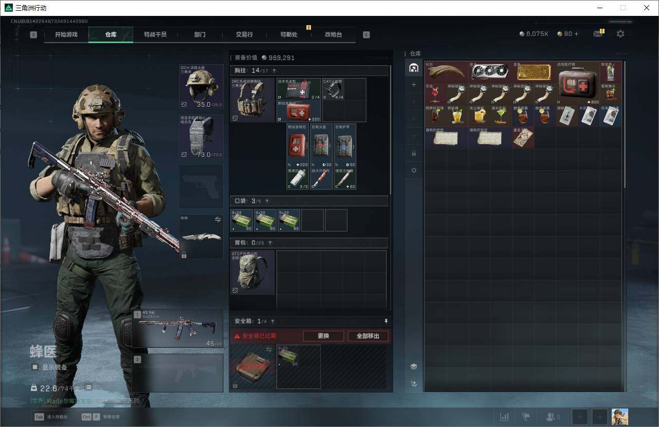 总资产(M):13M/哈夫币(K):6075K/传说枪皮数:1/全面战场等级:2_段位:无段位/烽火地带等级:29_段位:黄金/