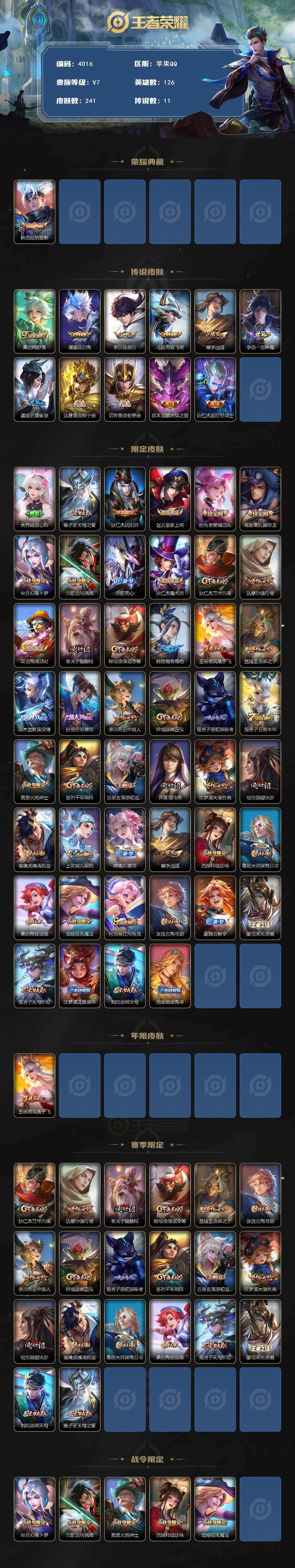 苹果Q-V6-至尊星耀III段位-126英雄-241皮肤-1典藏皮肤-11传说-65史诗