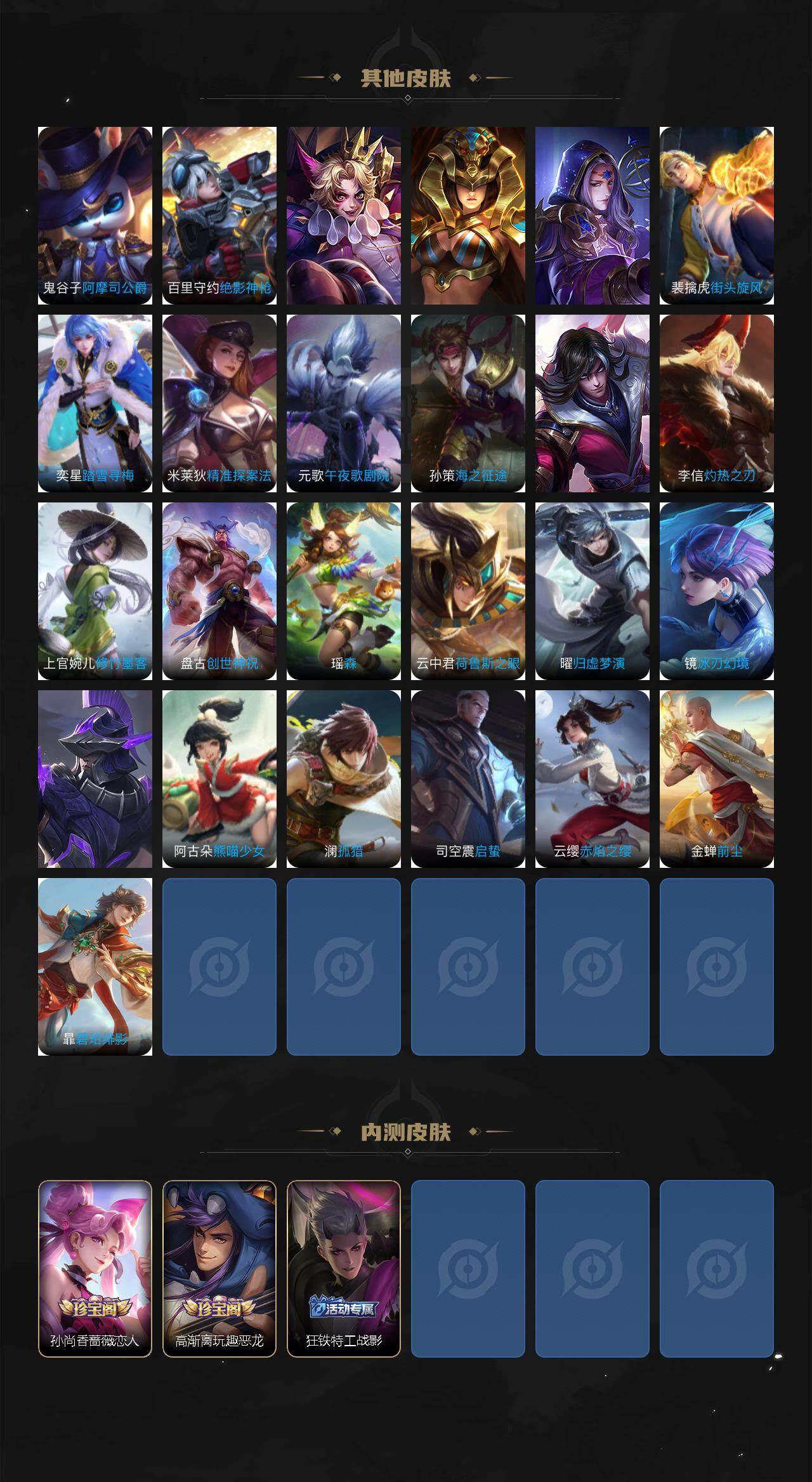 【传说皮肤】:桑启鸣野蒿,澜逐花归海,李白诗剑行,马超无双飞将,曜李逍遥 ,李信一念神魔,虞姬云霓雀翎,达摩黄金狮子座,后羿黄金射手座,宫本武藏地狱之眼,狄仁杰超时空战士