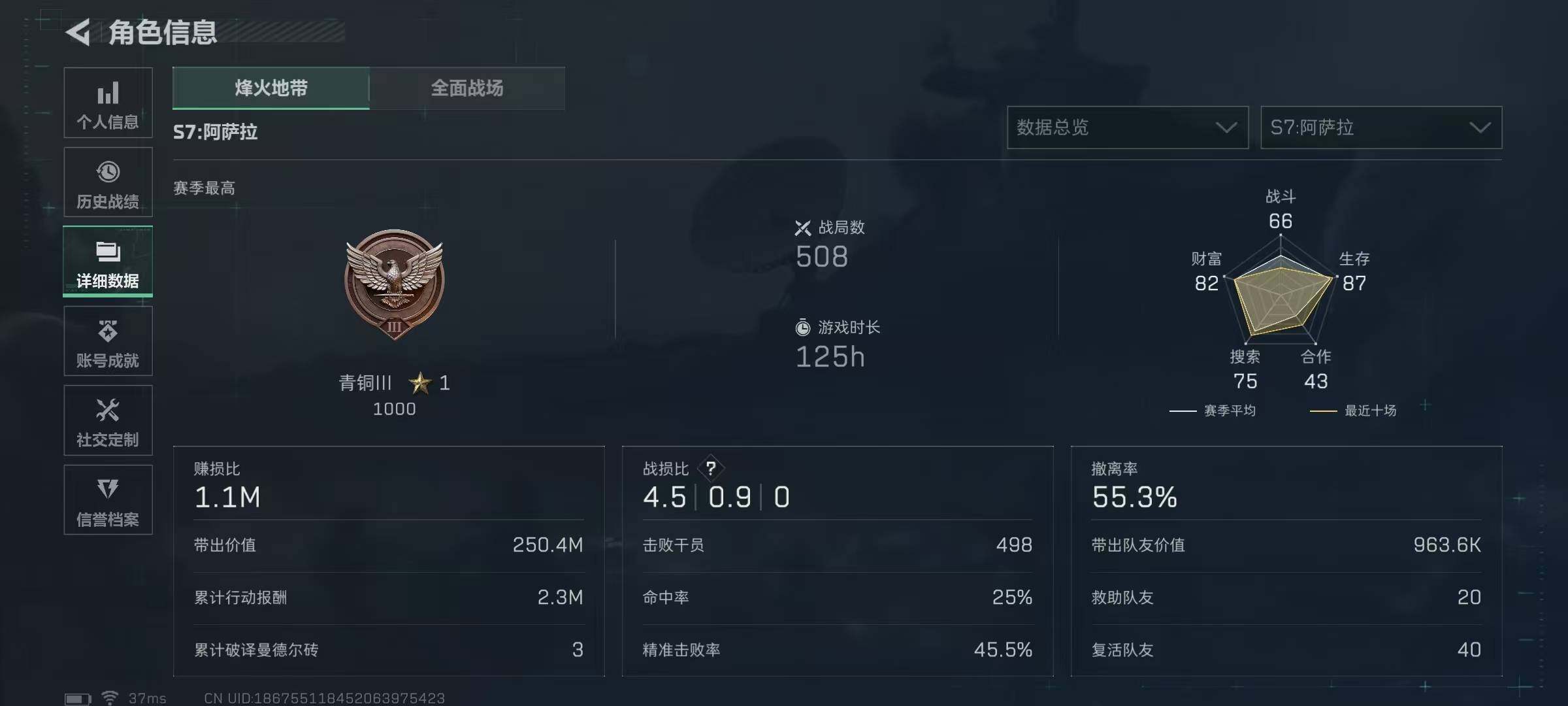 总资产(M):74M/哈夫币(K):3127K/全面战场等级:1_段位:无段位/烽火地带等级:60_段位:青铜