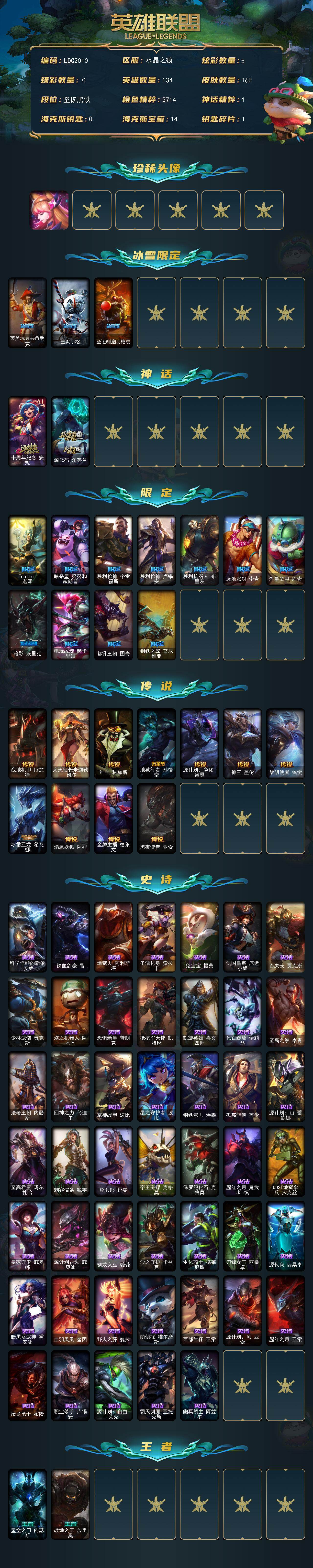 【LDC2010】134英雄/163皮肤/2神话/14限定/5炫彩/11传说/47史诗/未定级/星守阿狸头像/英勇玩具兵普朗克/雪默丁格/圣诞驯鹿克格莫/十周年纪念安妮/源代码乐芙兰/Fnatic迦娜/暗杀星努努和威朗普/胜利枪神格雷福斯/胜利枪神卢锡安/胜利机器人布里茨/泳池派对李青/外星装甲库奇/暗影沃里克/电玩战魂赫卡里姆/都铎王朝图奇/钢铁之翼艾尼维亚/战地机甲厄加特/大天使长米迦勒凯尔/绅士科加斯/地狱行者孙悟空/源计划净化薇恩/神王盖伦/黎明使者锐雯/冰霜亚龙希瓦娜/焰尾妖狐阿狸/金