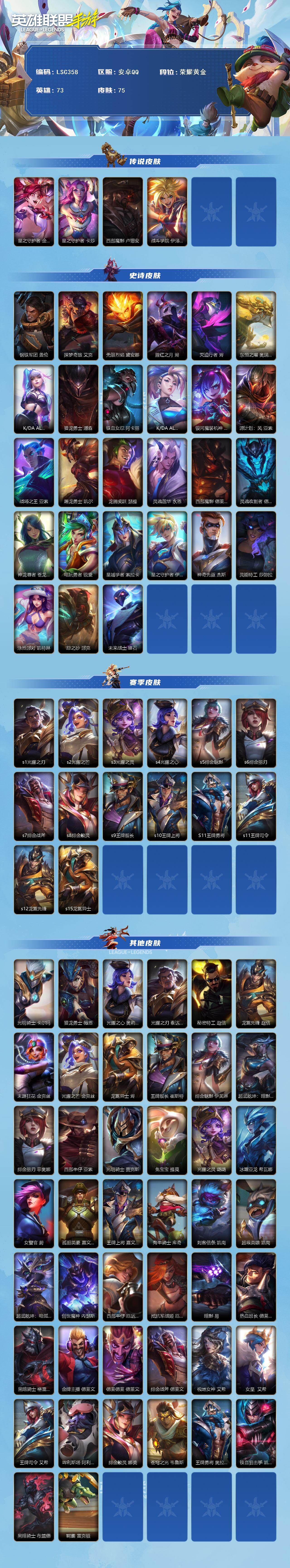 【LSC358】73英雄/75皮肤/荣耀黄金/星之守护者 金克丝/星之守护者 卡莎/西部魔影 卢锡安/战斗学院 伊泽瑞尔/钢铁军团 盖伦/探梦奇旅 艾克/无限烈焰 黛安娜/腥红之月 烬/灭迹行者 烬/东恒之曜 奥瑞利安·索尔/K/DA ALL OUT 伊芙琳/猎龙勇士 潘森/铁血女忍 阿卡丽/K/DA ALL OUT 阿卡丽/银河魔装机神 安妮/源计划:风 亚索/战场之王 亚索/屠龙勇士 凯尔/龙腾虎跃 瑟提/灵魂莲华 永恩/西部魔影 德莱厄斯/灵魂收割者 德莱文/神龙尊者 苍龙 艾希/电玩勇者