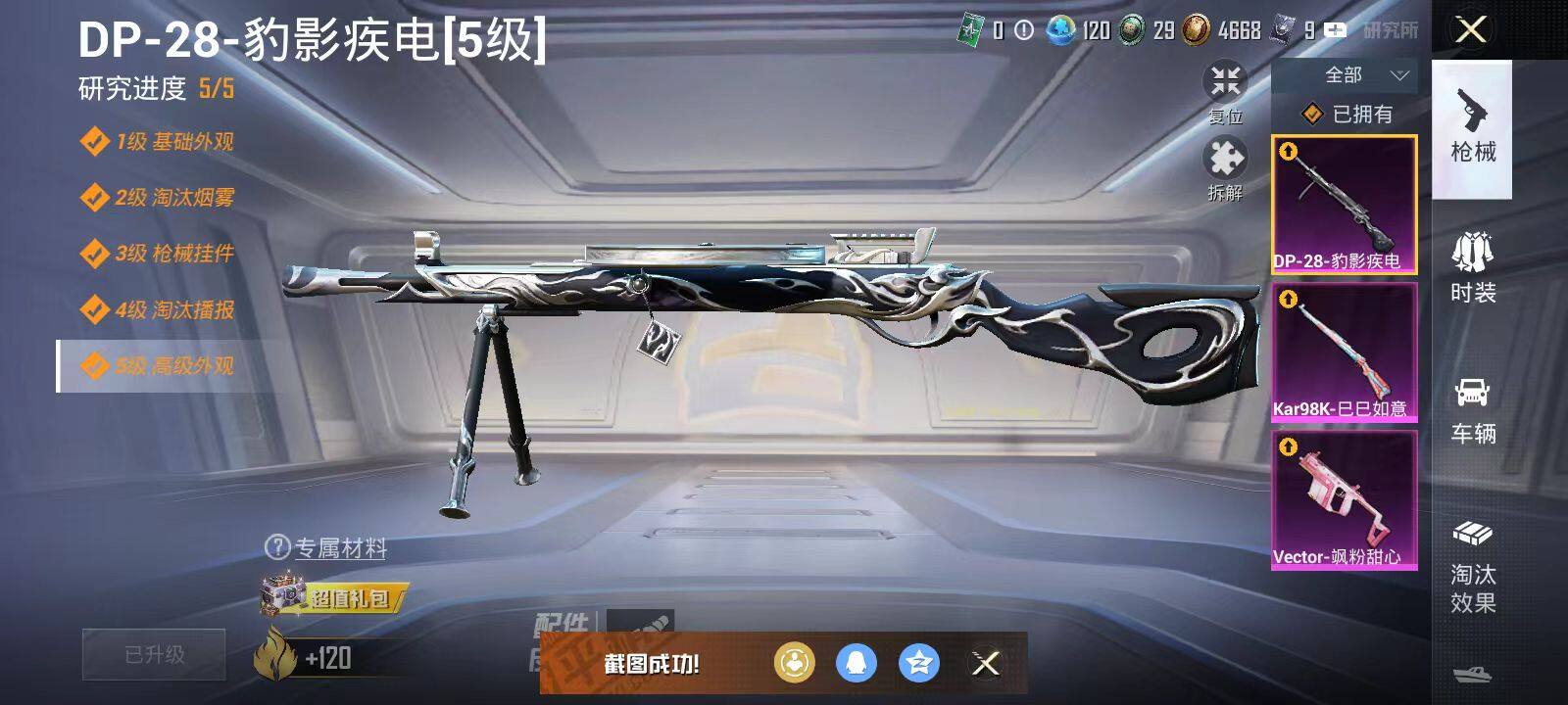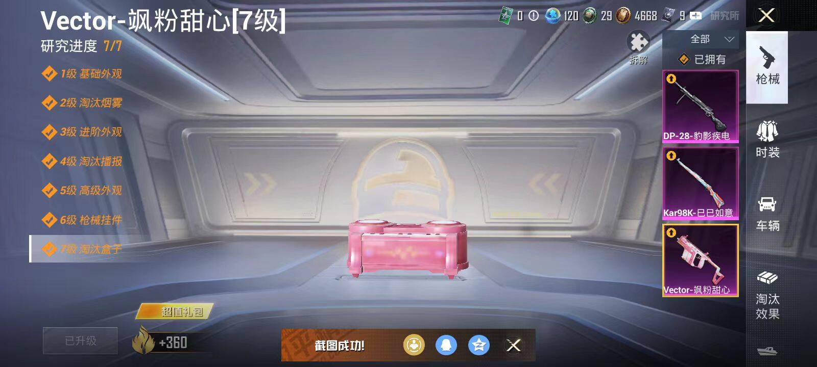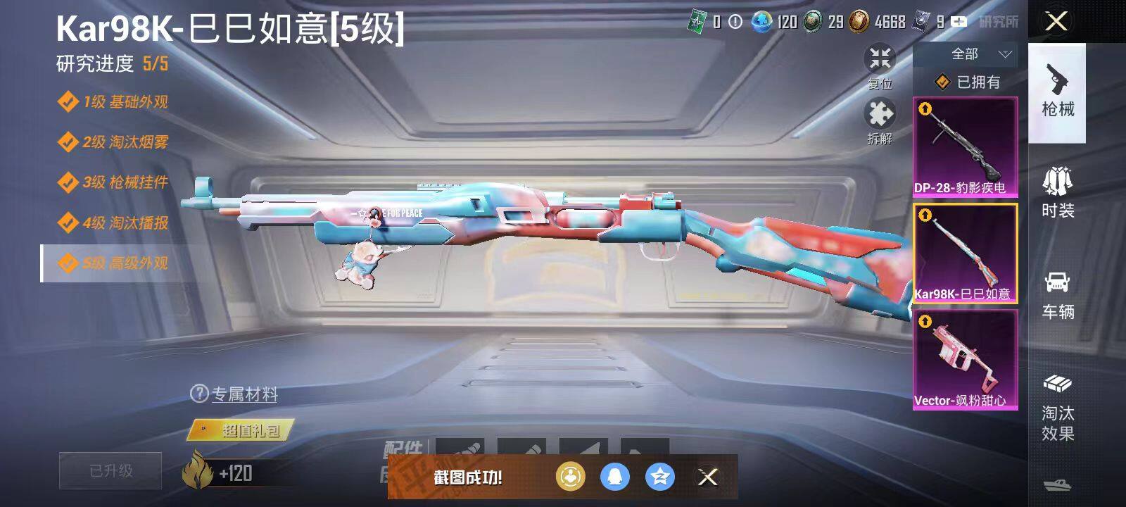 【粉色枪皮等级】:Vector-飒粉甜心(七级),Kar98K-巳巳如意(五级),DP-28-豹影疾电(五级)