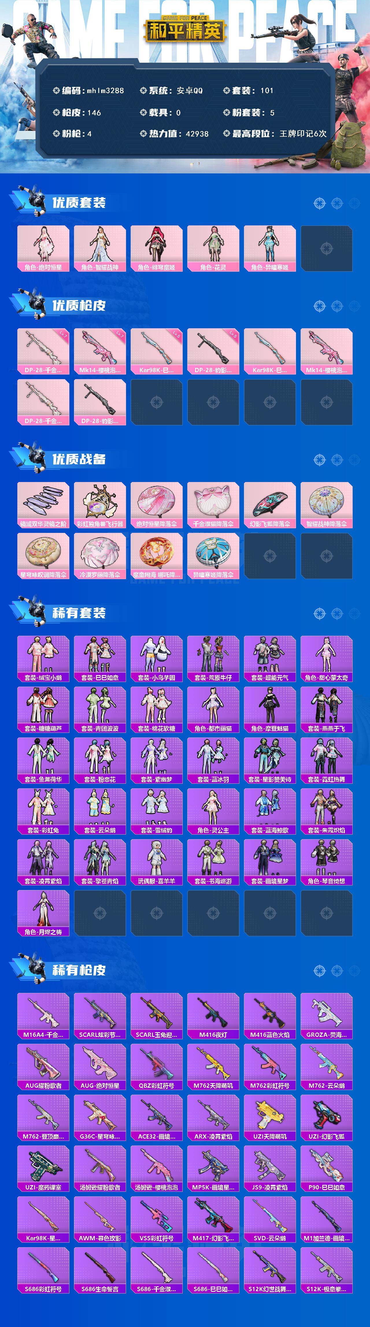 【mhlm3288】安卓 手Q-5粉装-4特效枪-0载具-3粉色飞行器-42938热力值-6王牌印记-101套装-146枪皮