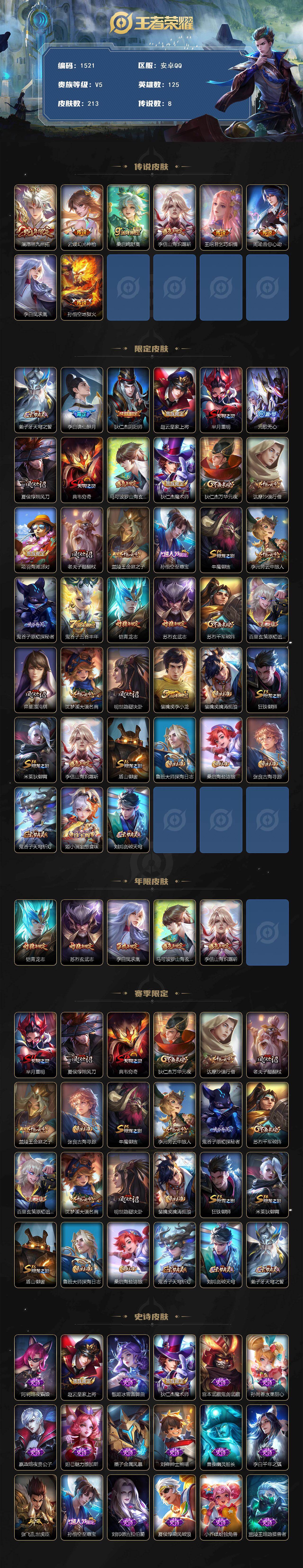 【猴子打野号 至尊宝地狱火 李白凤求凰 澜愿照九州拓】安卓Q-V5-尊贵铂金IV段位-125英雄-213皮肤-8传说-41史诗