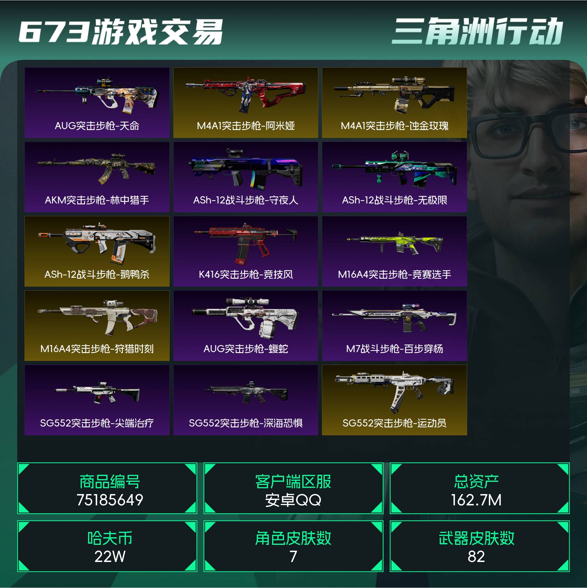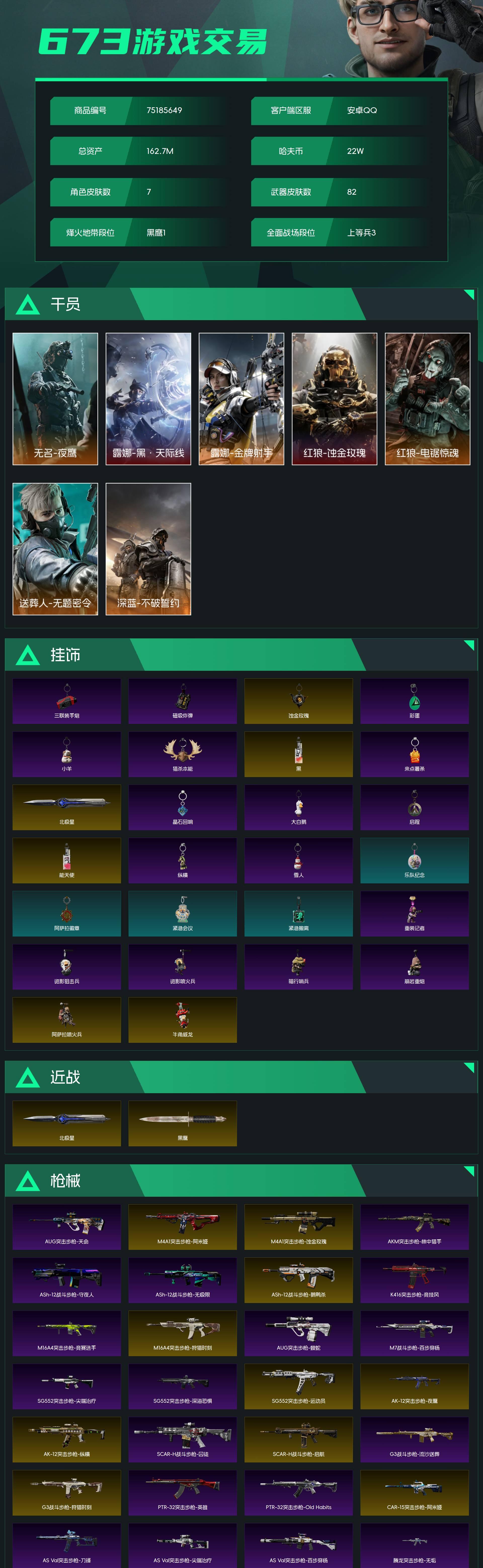 烽火段位黑鹰1 战场段位上等兵3 总资产162.7M 哈夫币22W 干员7 挂饰26 近战2 枪械82 载具42