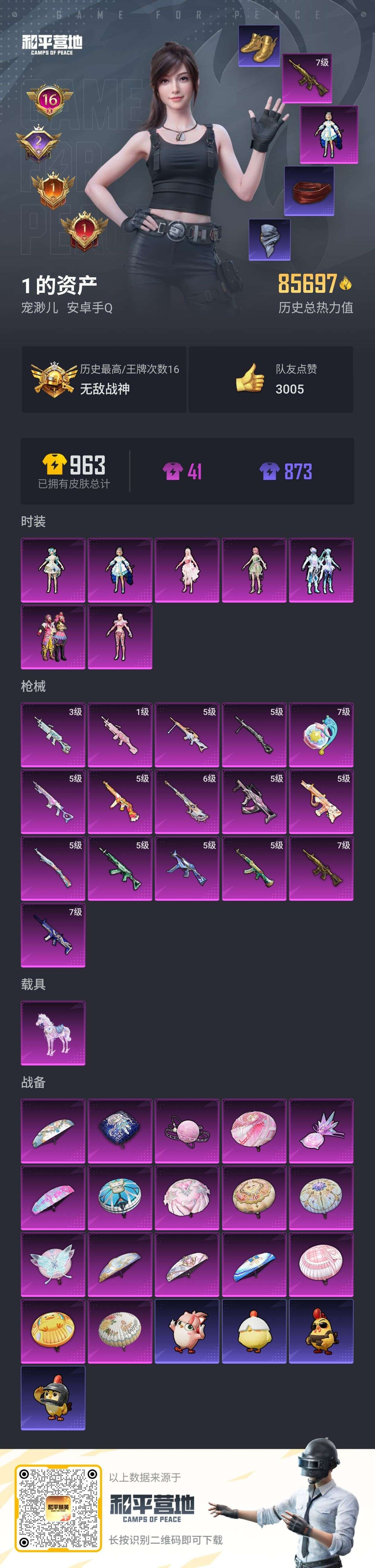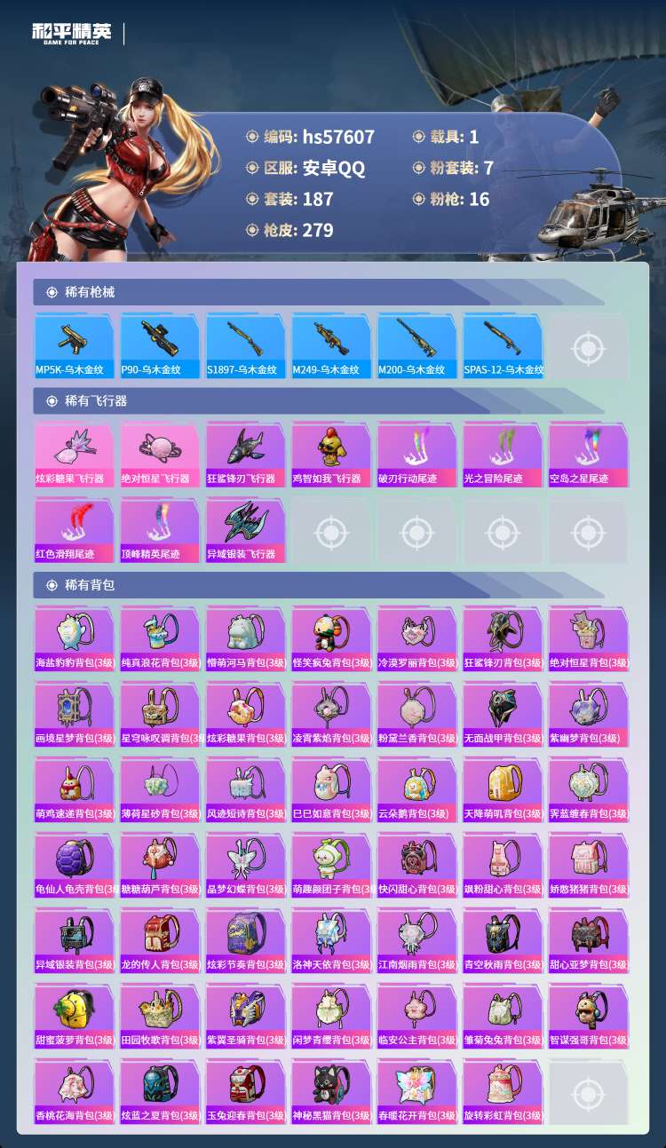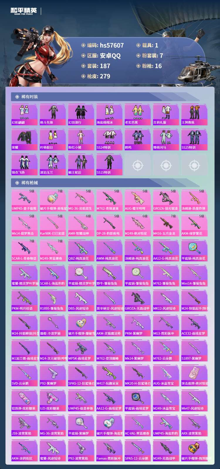 hs57607 安卓手Q-16王牌印记-有战神框-7粉装-16特效枪-1载具-87457热力值-18