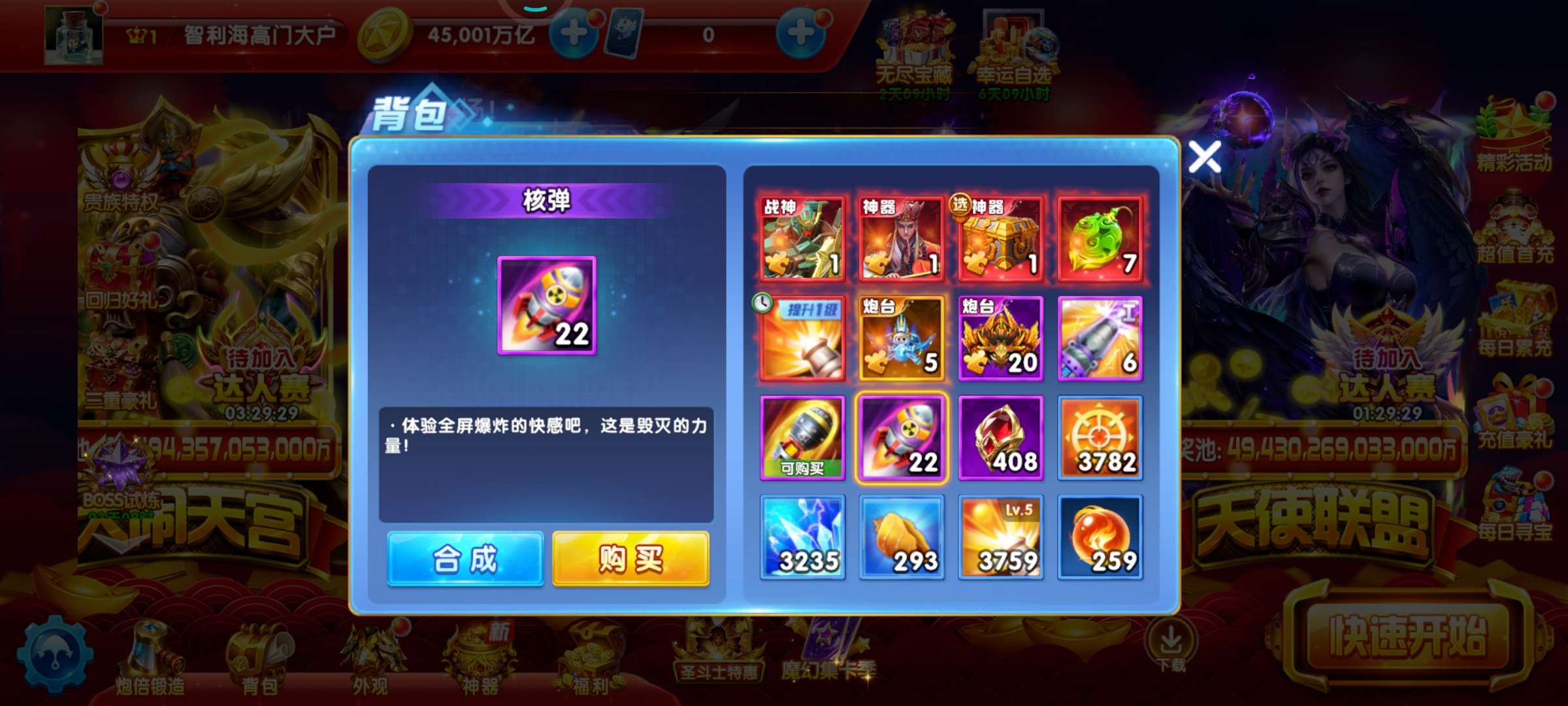 450万亿 60炮 带滋炮台 巅峰12级 加速翅膀6天 5级狂2天 狂暴3759 核弹22 激光6