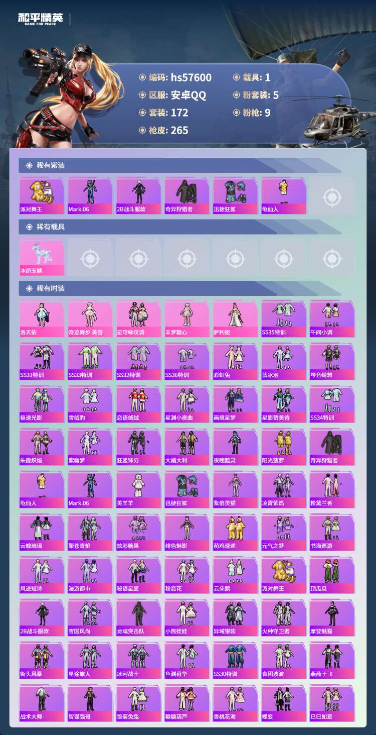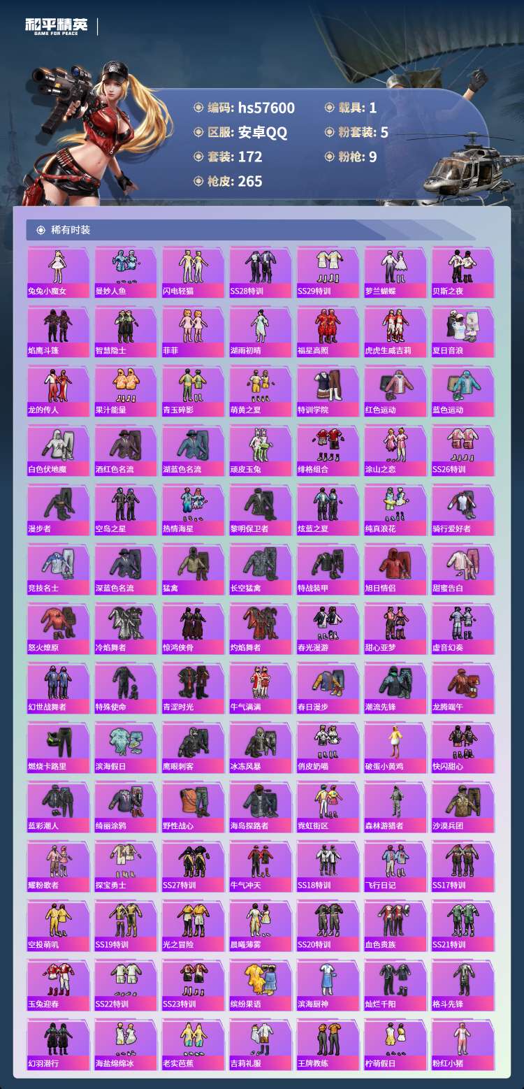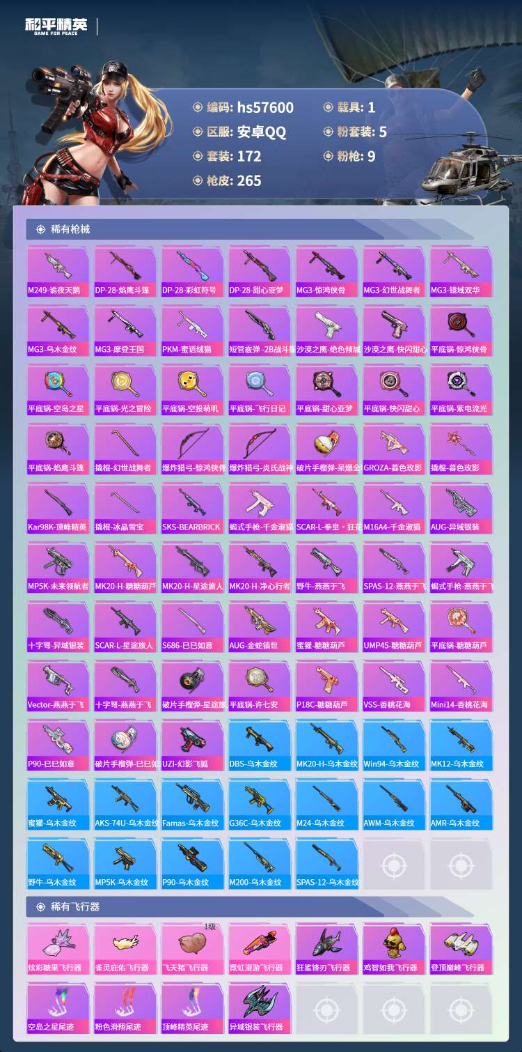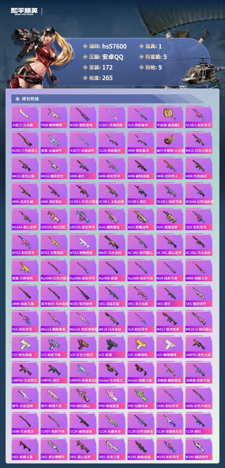 hs57600 安卓手Q-18王牌印记-5粉装-9特效枪-1载具-80781热力值-172套装-26