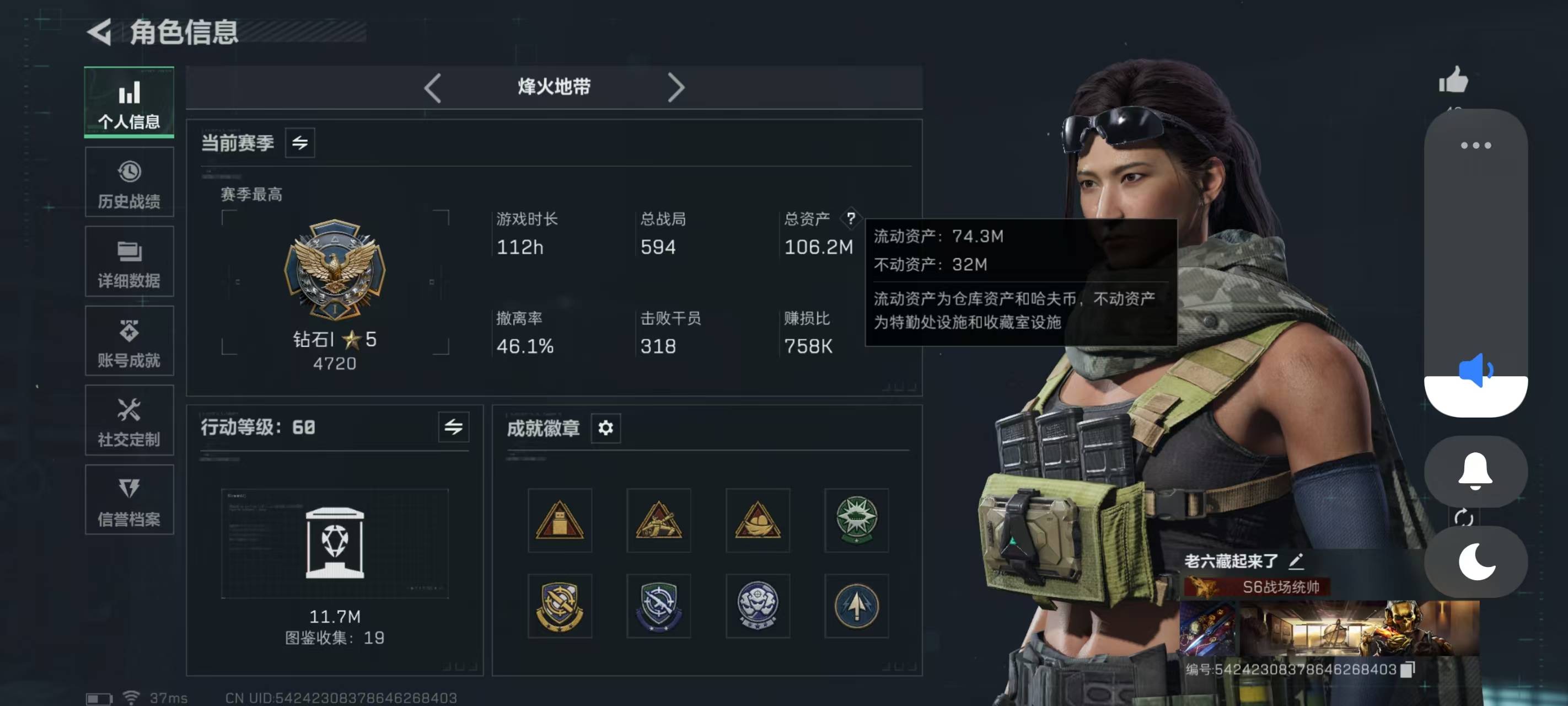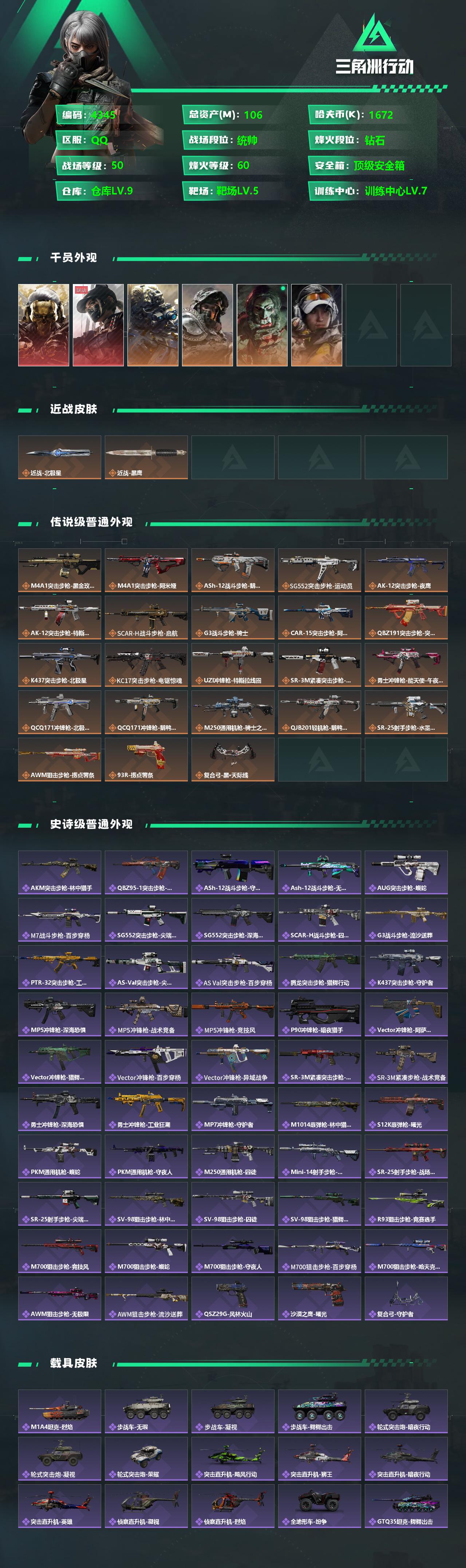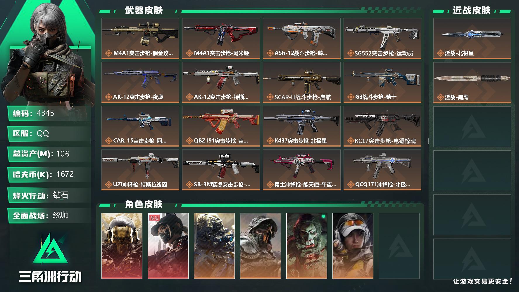 总资产106.2m 流动资产74.3m 哈夫币1672k 1刀 2红皮 3金皮 顶级安全箱 仓库lv