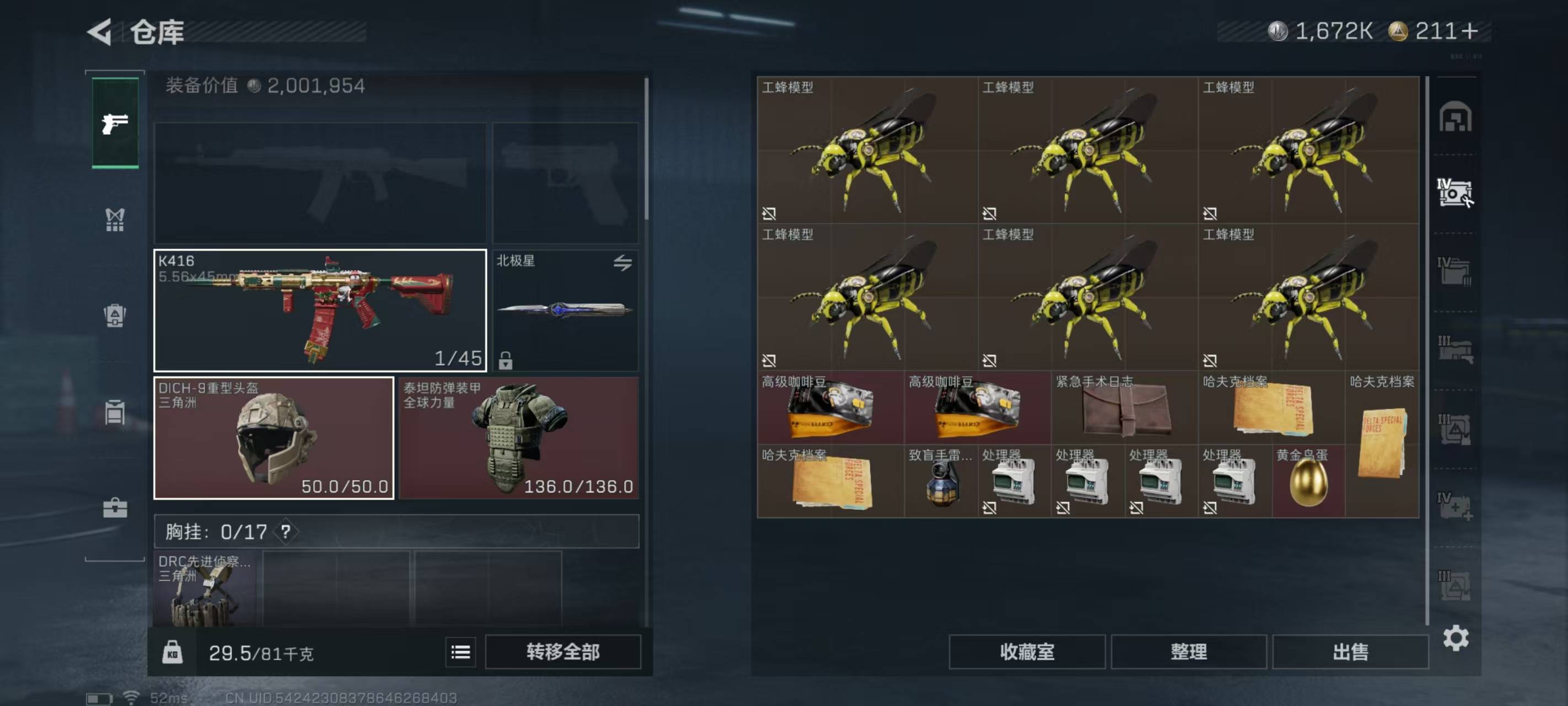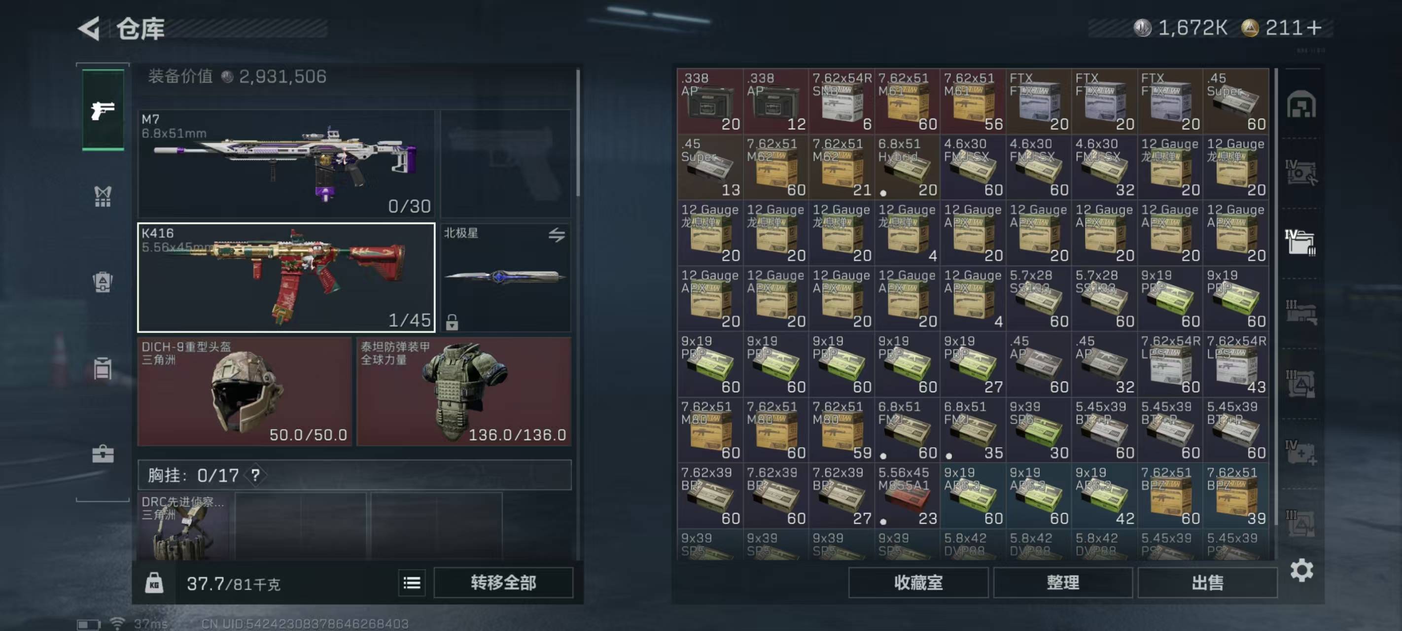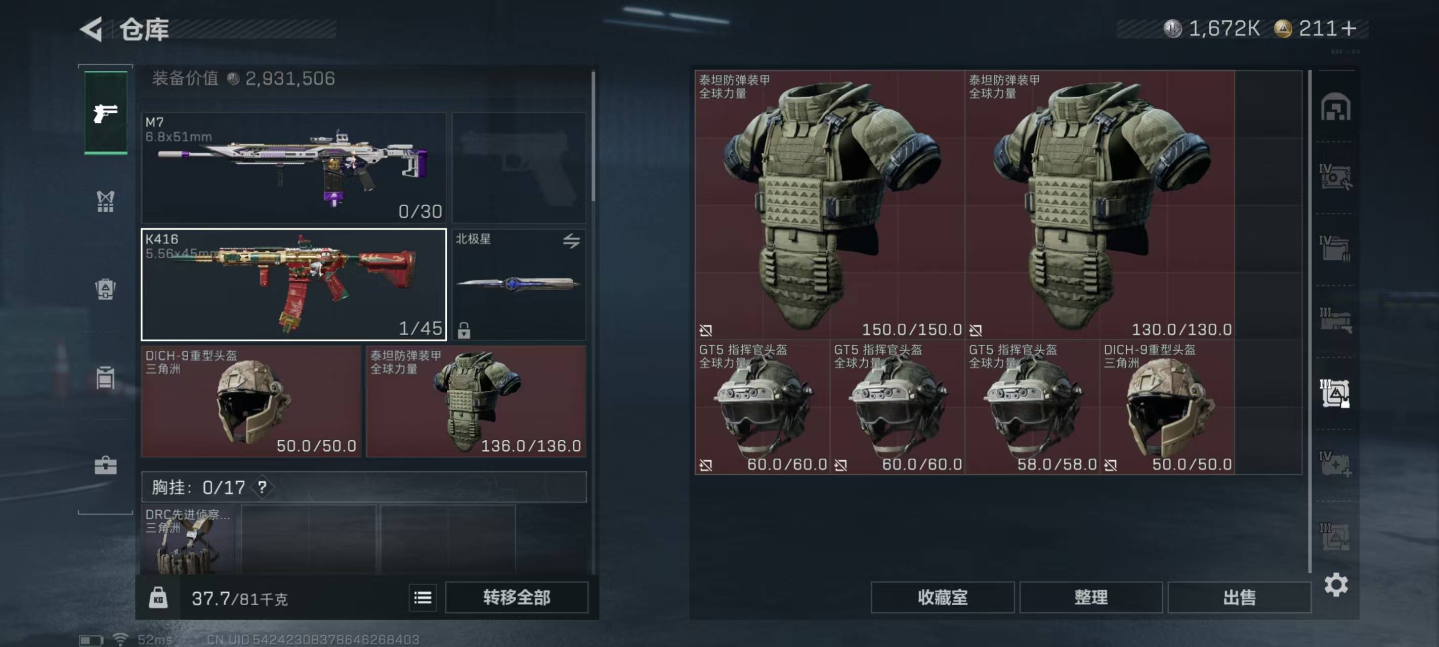 总资产106.2m 流动资产74.3m 哈夫币1672k 1刀 2红皮 3金皮 顶级安全箱 仓库lv