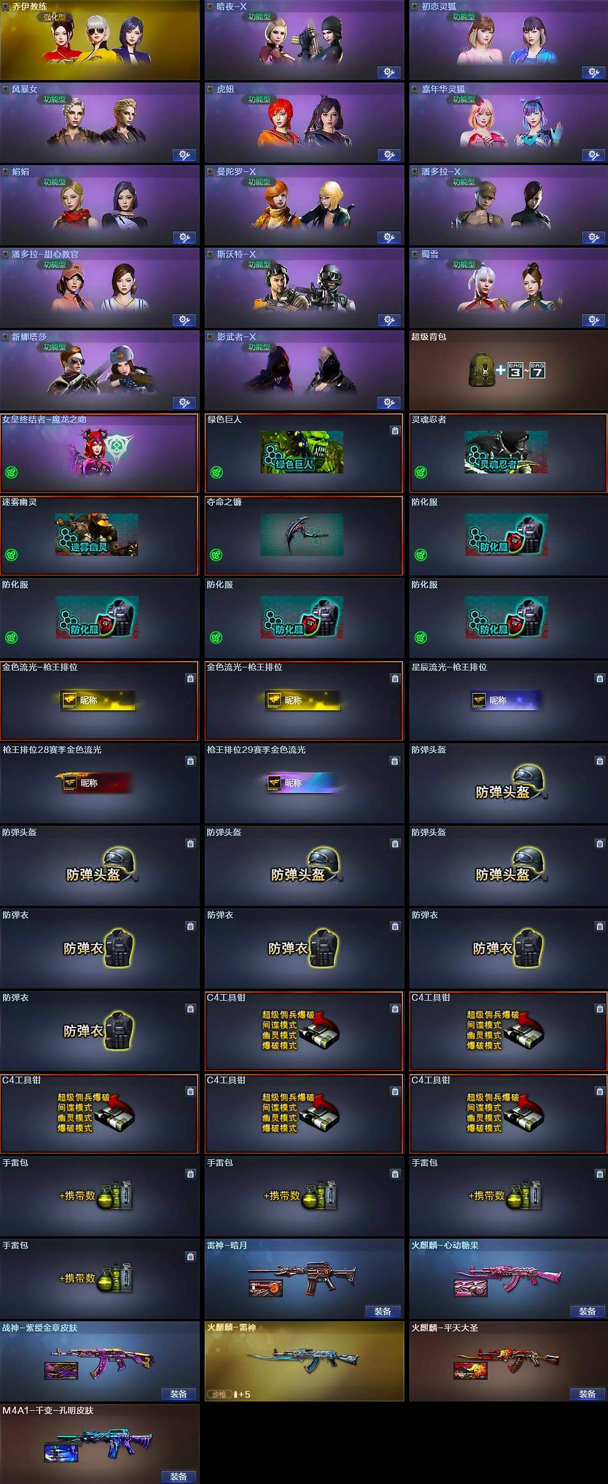 【皮肤】:雷神-暗月,火麒麟-雷神,火麒麟-平天大圣,火麒麟-心动糖果,毁灭-英雄计划 皮肤,M4A1-千变-孔明皮肤,战神-紫绶金章皮肤,AK47-B-常胜将军-曹操*2