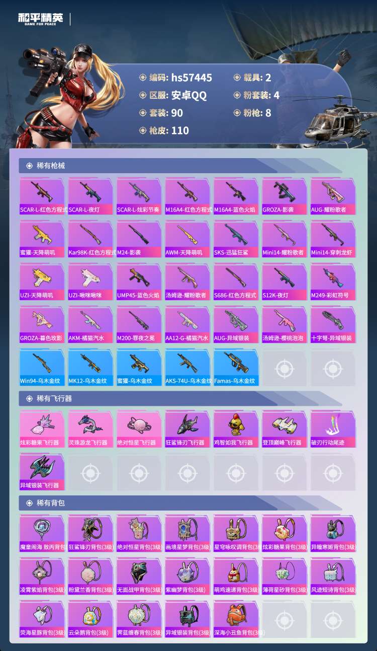 hs57445 安卓手Q-4王牌印记-4粉装-8特效枪-2载具-34269热力值-90套装-110枪