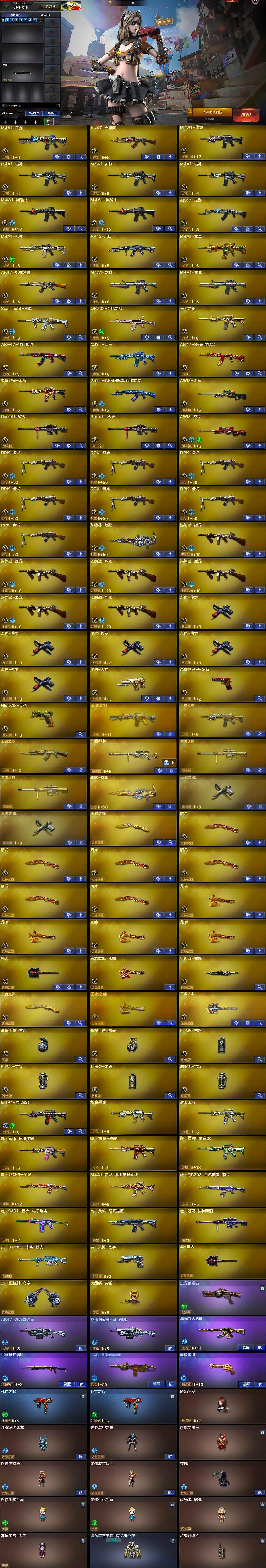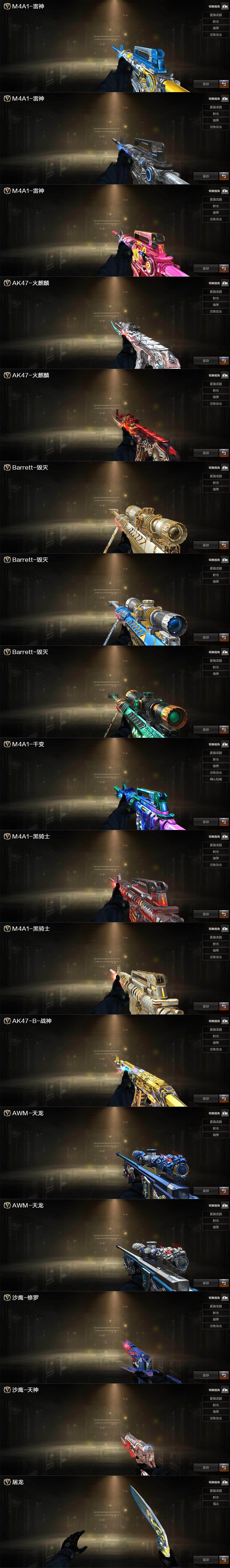 【热门武器】:王者幻神,QBZ03-金色蔷薇,Scar Light-白虎,死亡之眼*2,荣耀世冠-雷神,荣耀世冠-柯尔特,M4A1-黑骑士*2,汤姆逊-烈龙*6,RPK-盘龙*7,加特林-炼狱,COP 357-雷霆王者,沙鹰-修罗*5,荣耀世冠-龙啸,金刚伞